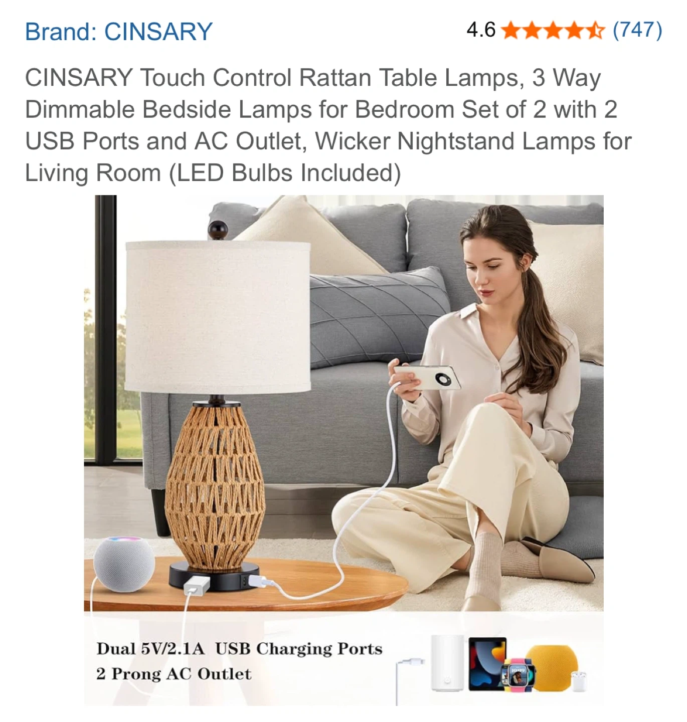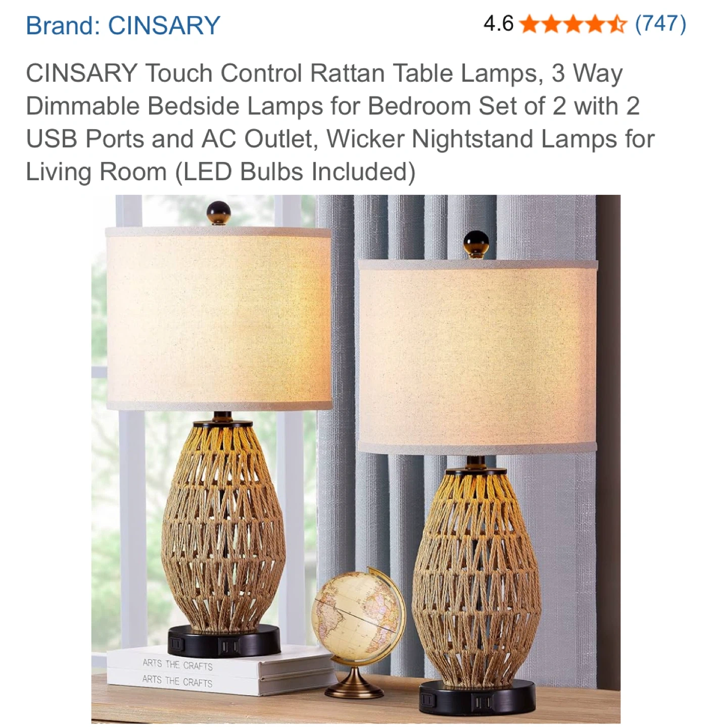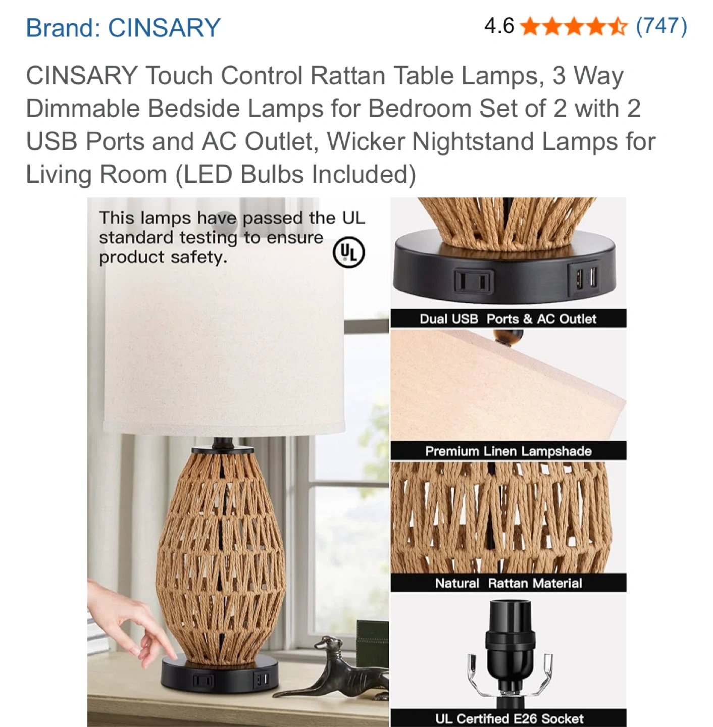 Selling a CINSARY touch control rattan table lamp! It's a 3-way dimmable bedside lamp perfect for a bedroom or living room. It comes with 2 USB ports and an AC outlet, and features a premium linen lampshade and a UL certified E26 socket