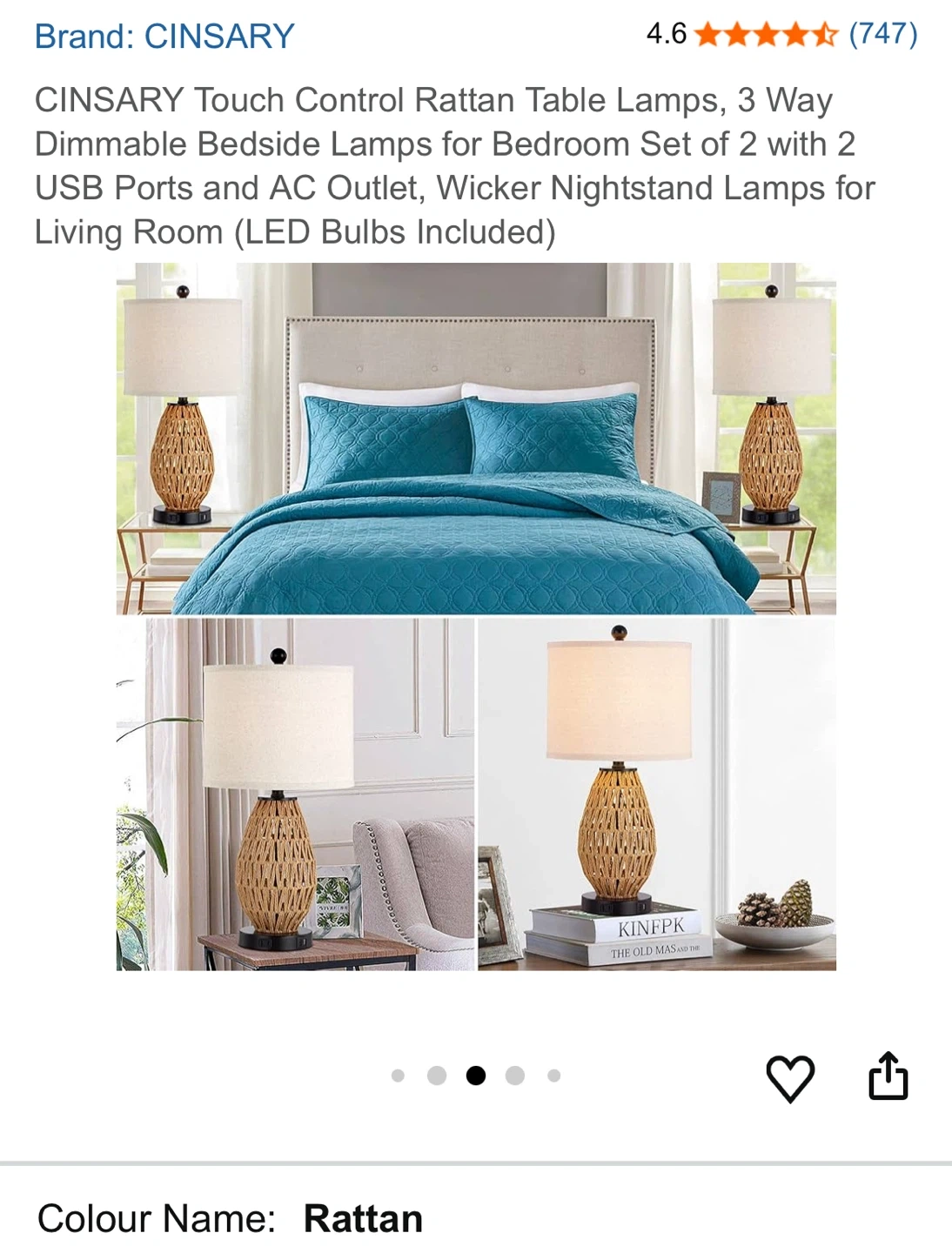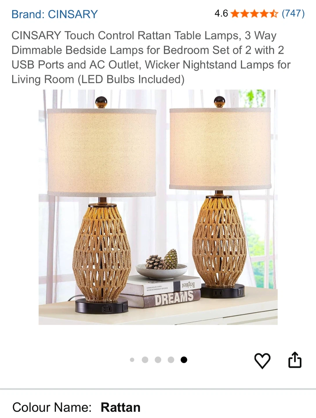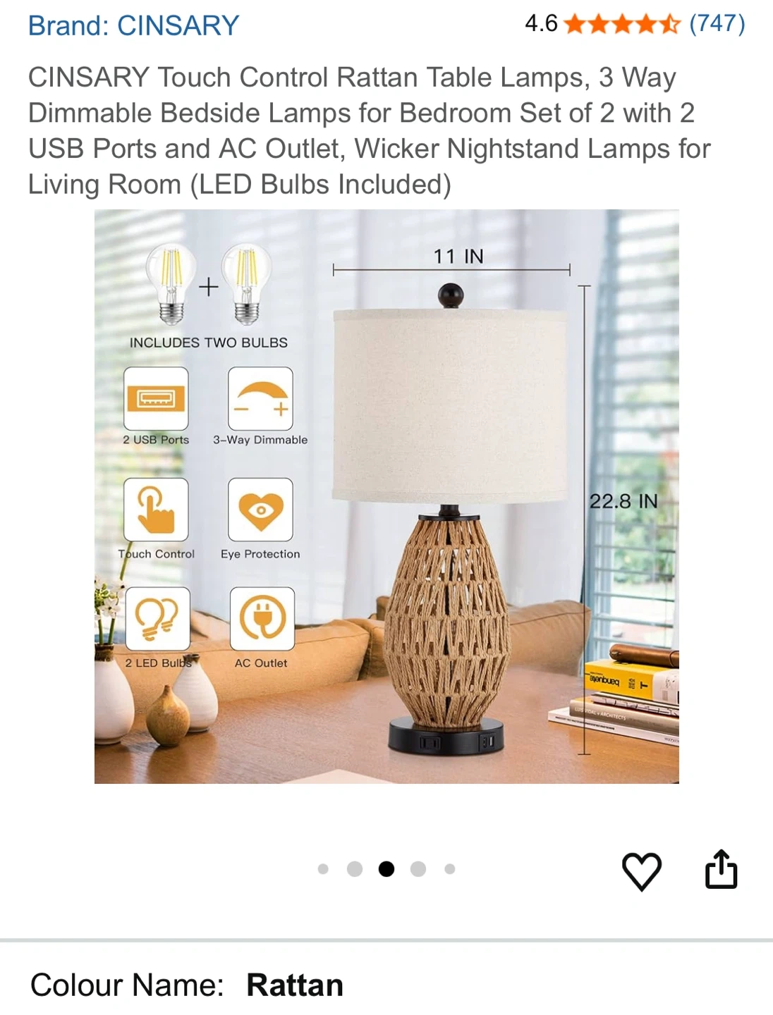 Selling a CINSARY touch control rattan table lamp! It's a 3-way dimmable bedside lamp perfect for a bedroom or living room. It comes with 2 USB ports and an AC outlet, and features a premium linen lampshade and a UL certified E26 socket