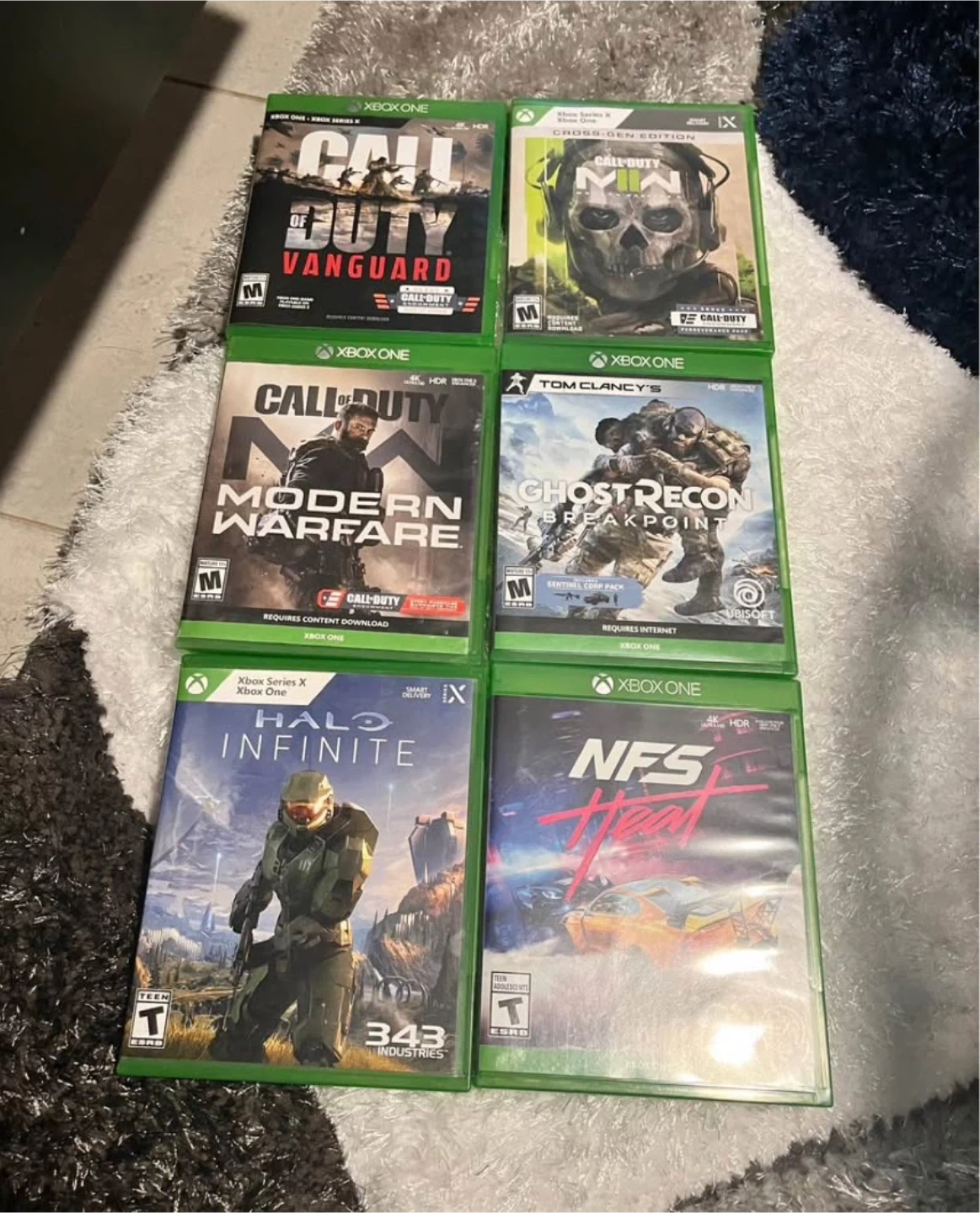Collection of Xbox One video games including Call of Duty Vanguard, Modern Warfare, and Infinite. Also includes Tom Clancy's Ghost Recon Breakpoint and Need for Speed Heat.