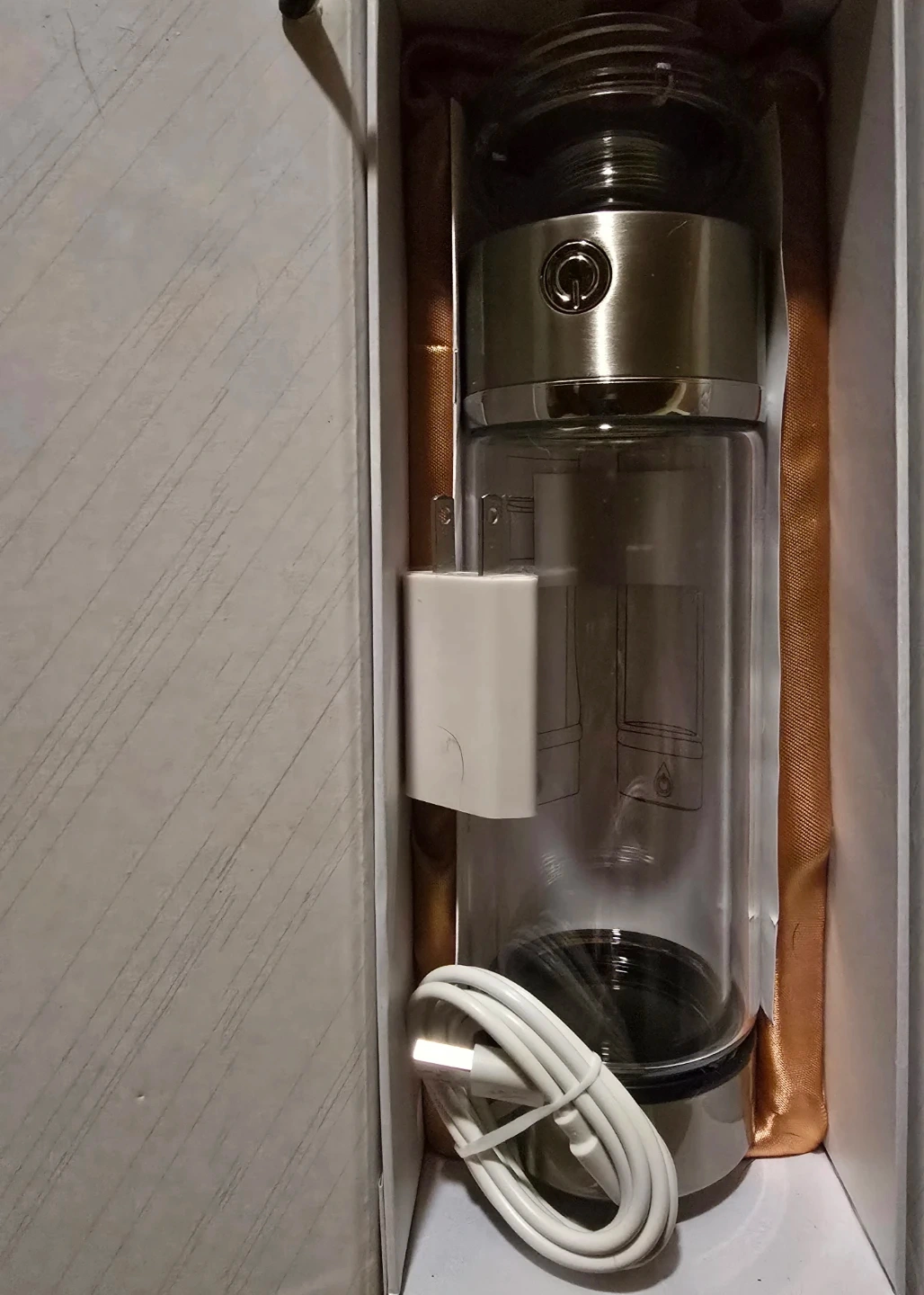 This is a hydrogen water generator bottle. It comes with a charger and a USB cable. It's made of glass and stainless steel. This bottle is great for making hydrogen-rich water on the go!