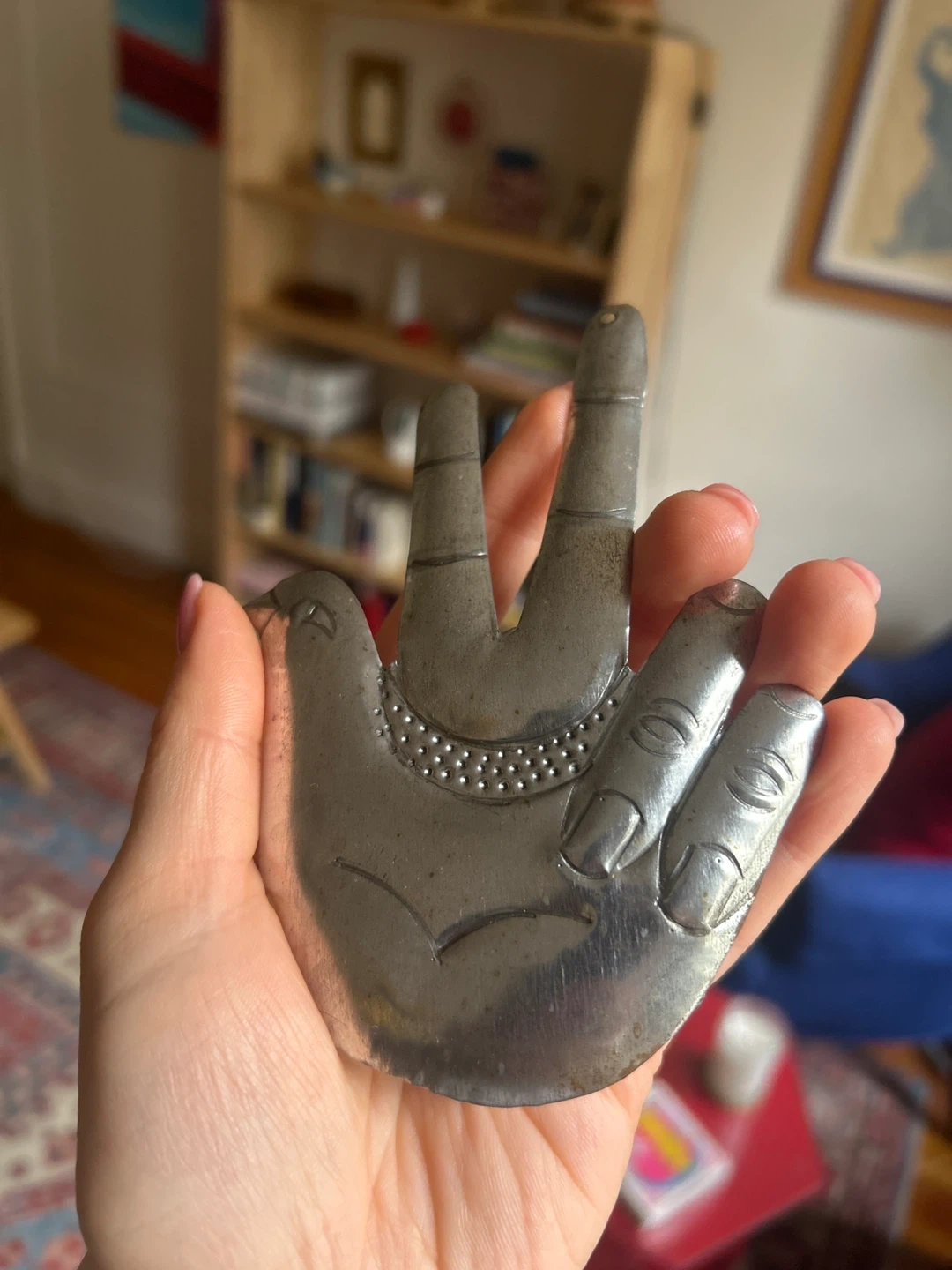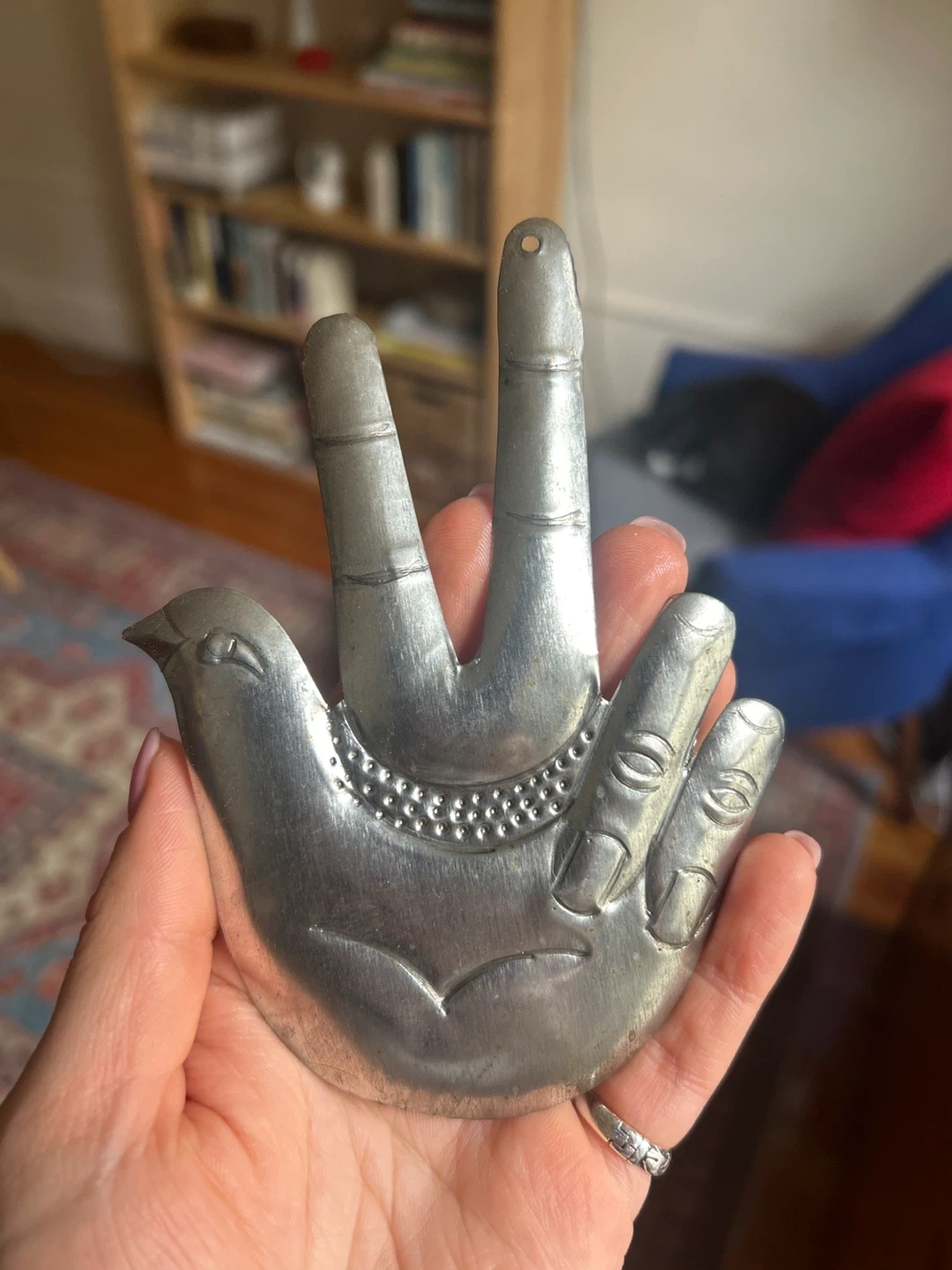 This is a Mexican tin wall ornament melding together a dove and a hand making a peace sign. It features intricate detailing on the hand and has a silver finish. It has some slight wear and tear as seen in the photos. It's a unique decorative piece for your home!
