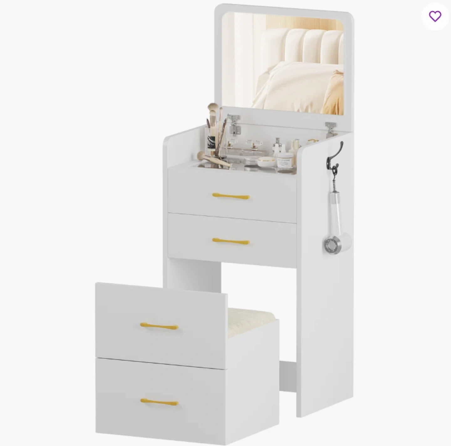This white vanity set features a mirror with a lift-top compartment for storage. It includes a matching stool and several drawers for organizing your essentials. White finish with gold-toned drawer pulls. It's a great addition to any bedroom or dressing area!