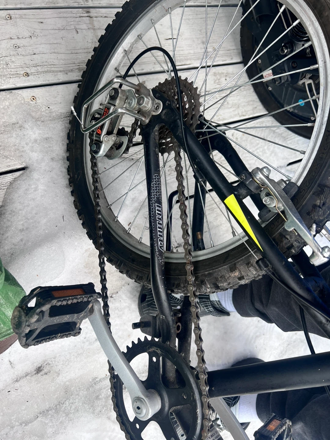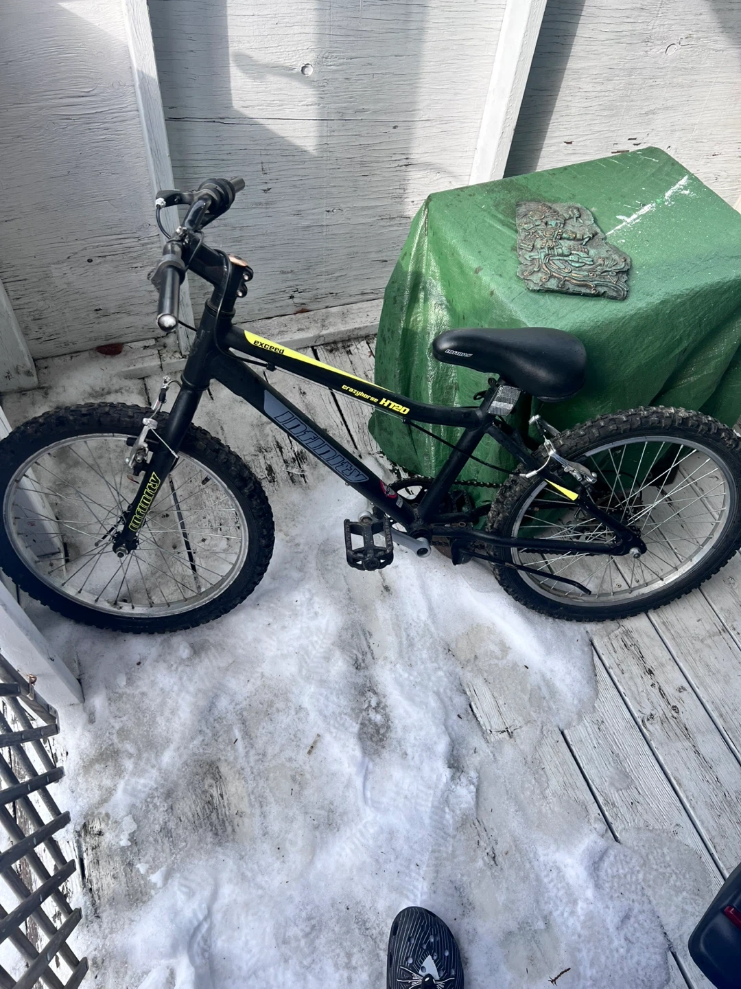 This is a Mountain Tek HT50 kids bike. It's black with yellow accents. Features a sturdy frame and knobby tires for varied terrain.