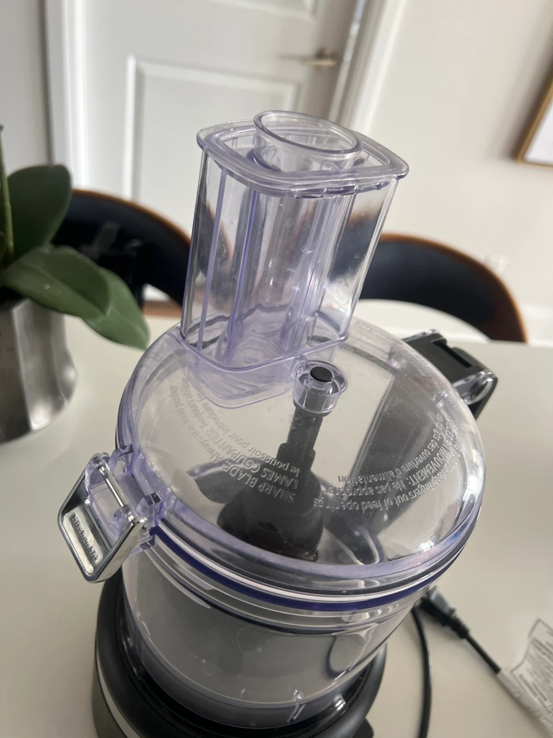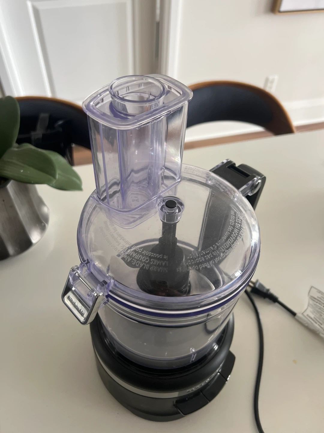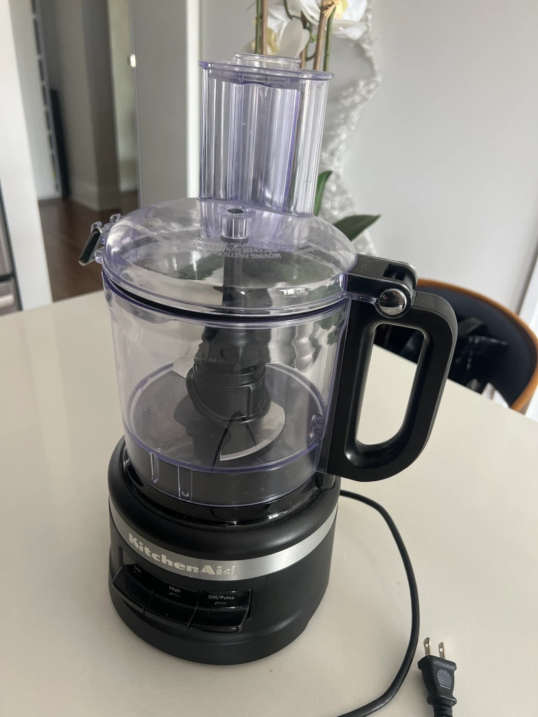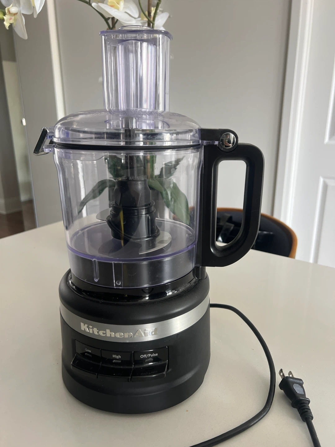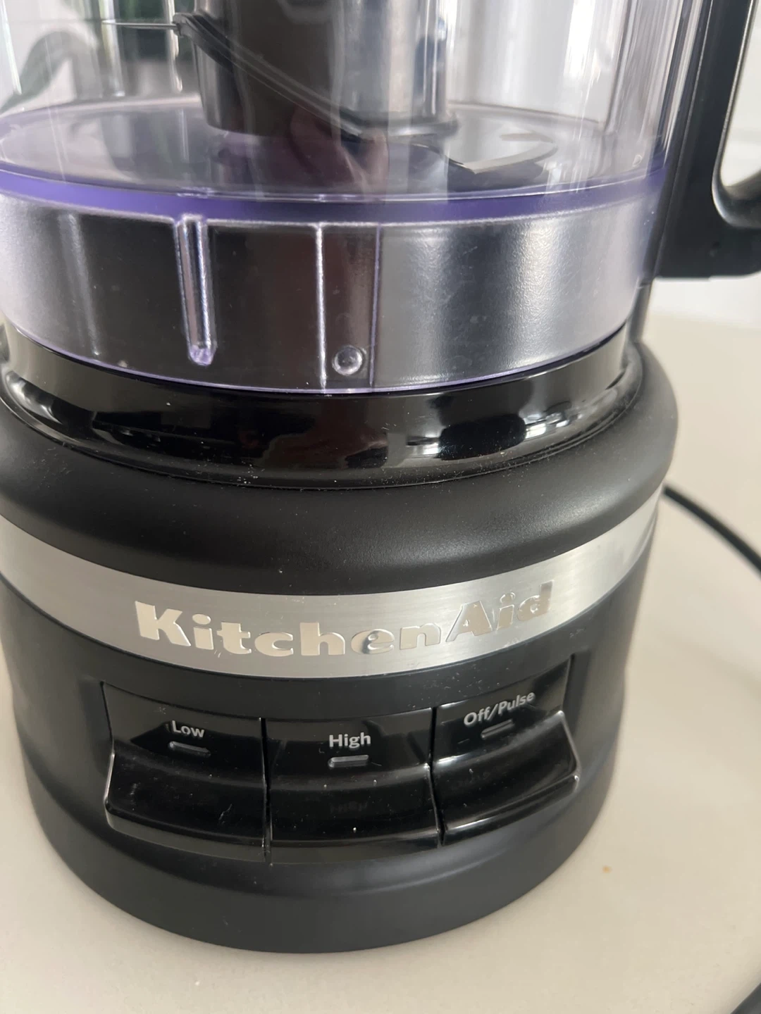 This is a black KitchenAid food processor. It has low, high, and off/pulse settings. It's a handy appliance for chopping and dicing ingredients.