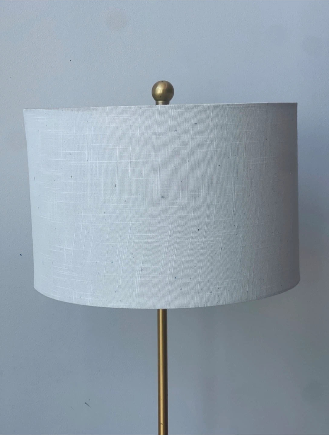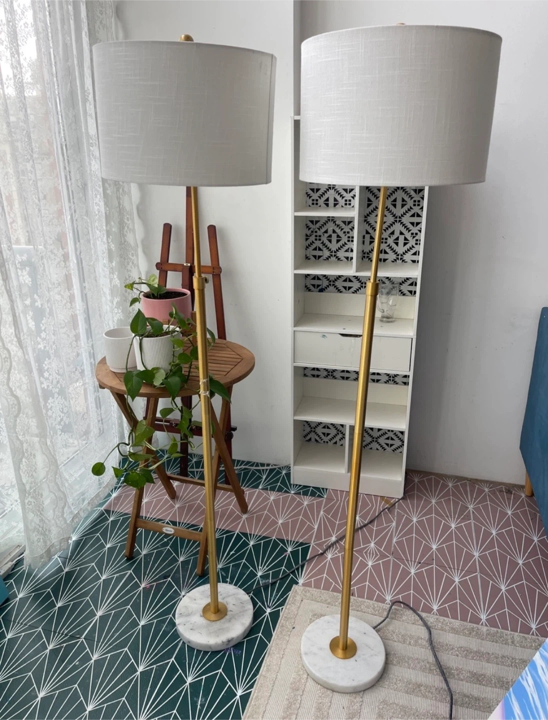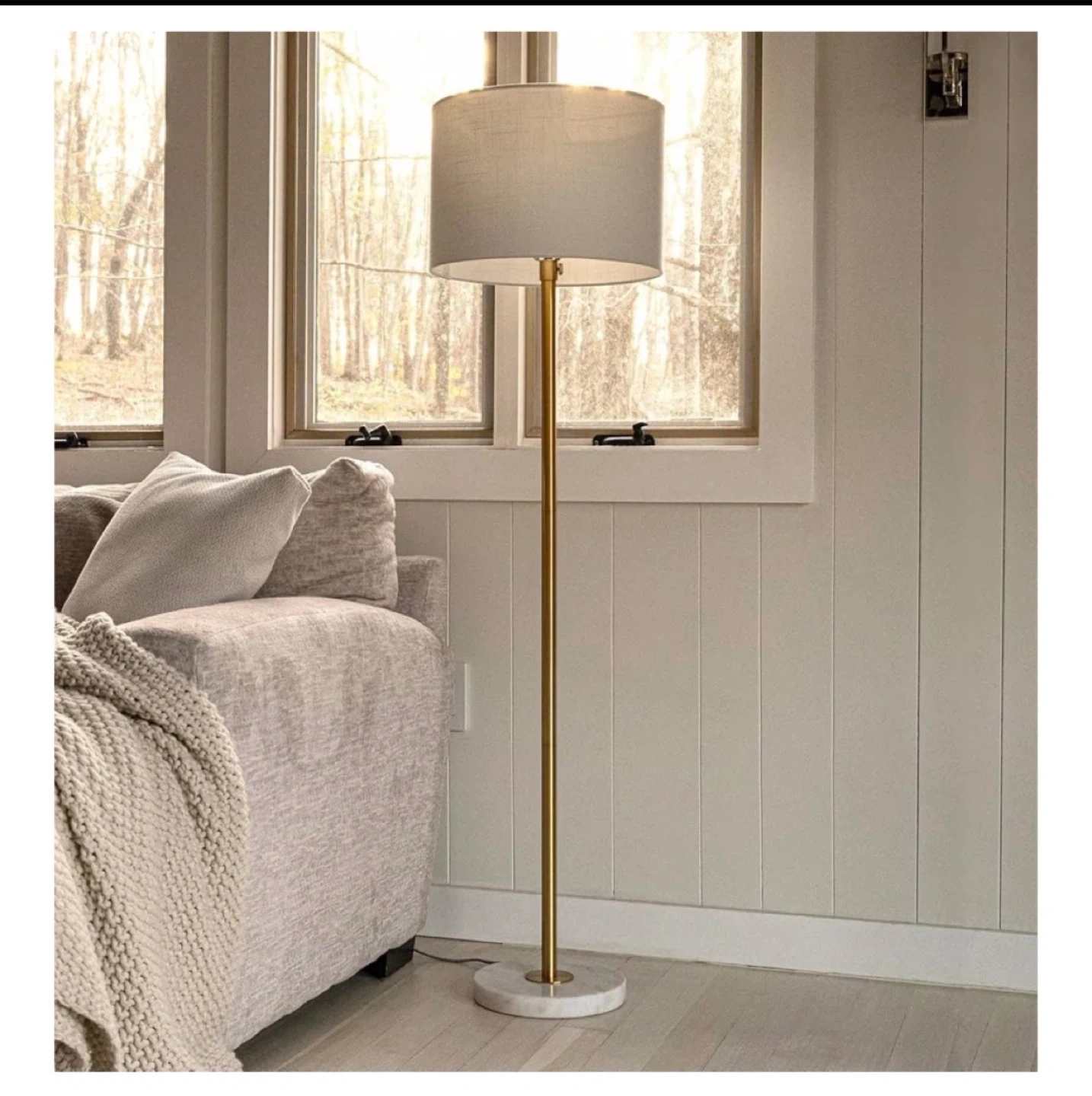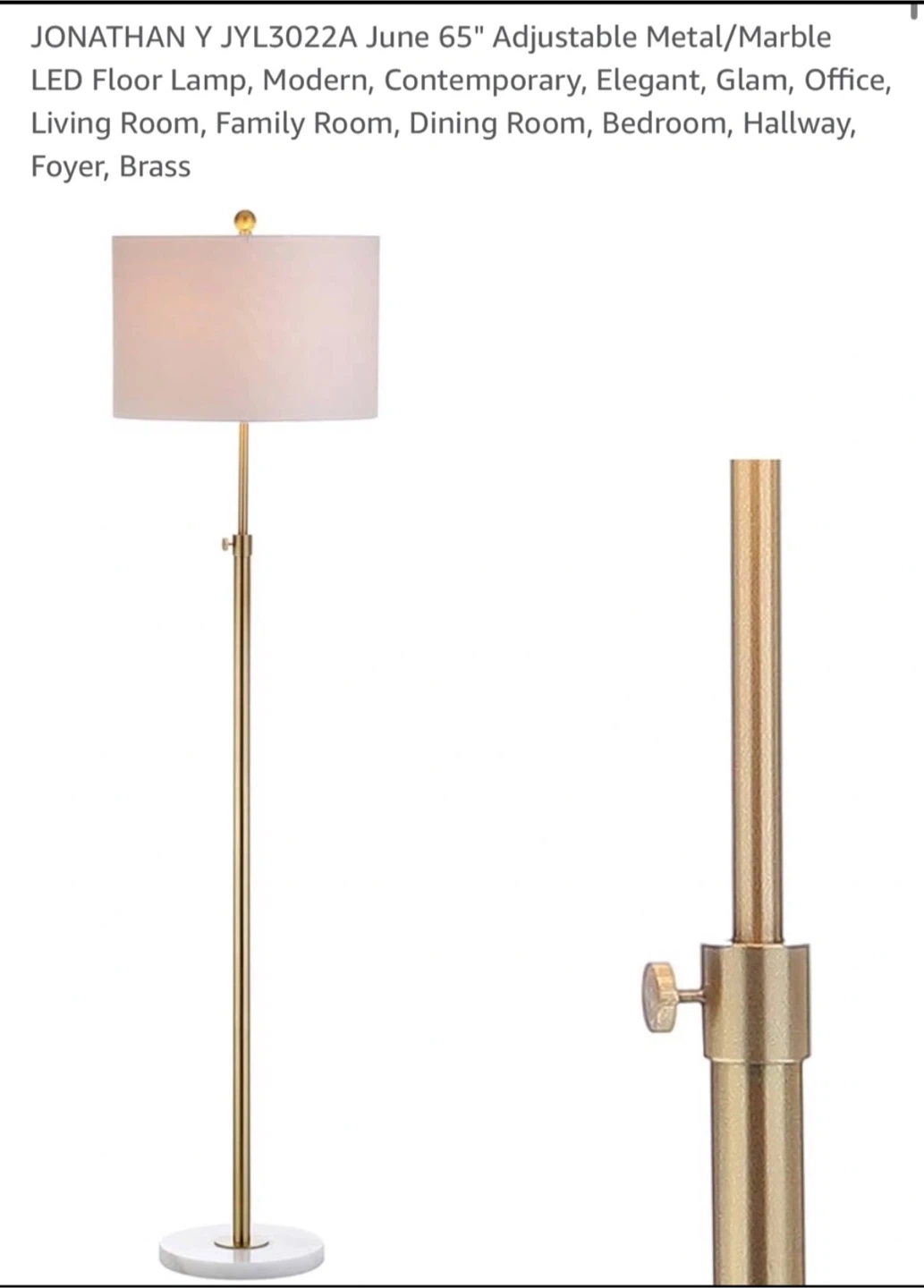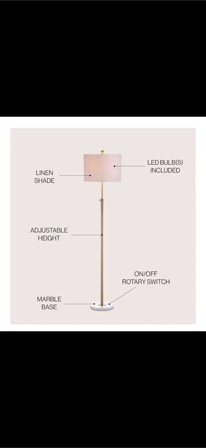 Adjustable height floor lamp. Brass gold metal pole. White marble base. Linen shade. LED bulb included. On/off rotary switch. One lamp is in perfect condition and the second's lamp shade has insignificant traces of paint, visible upon very close up look