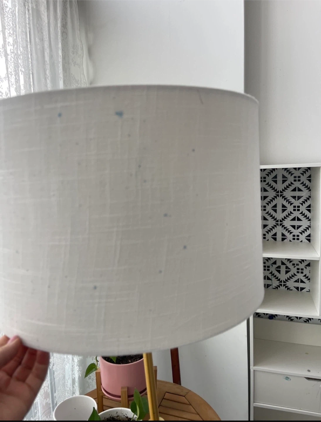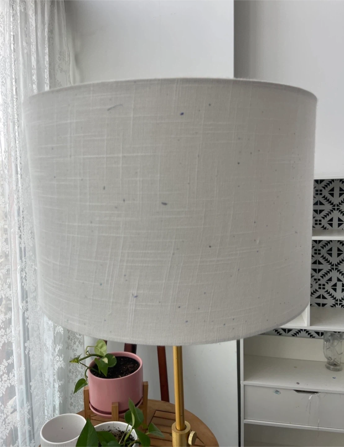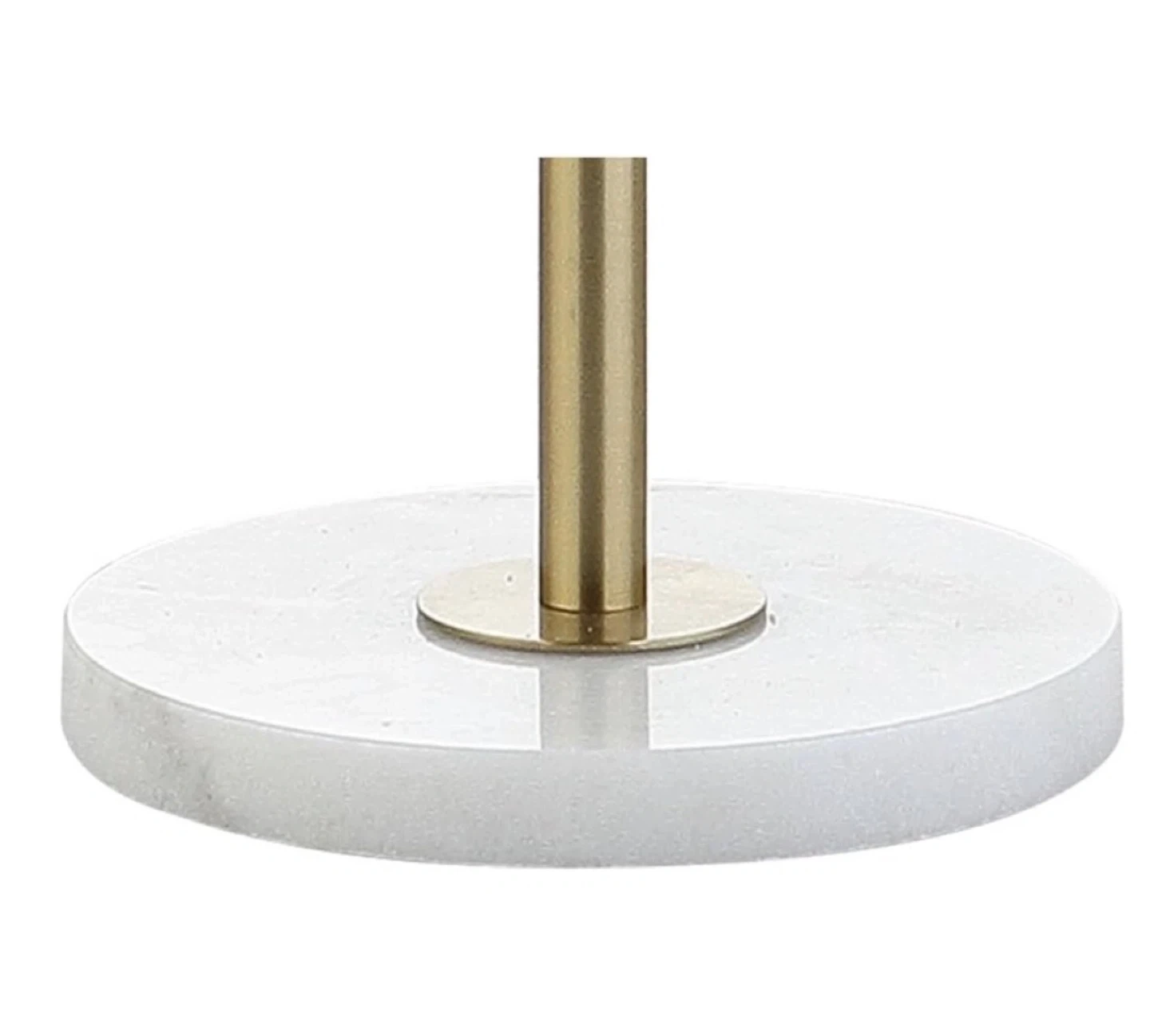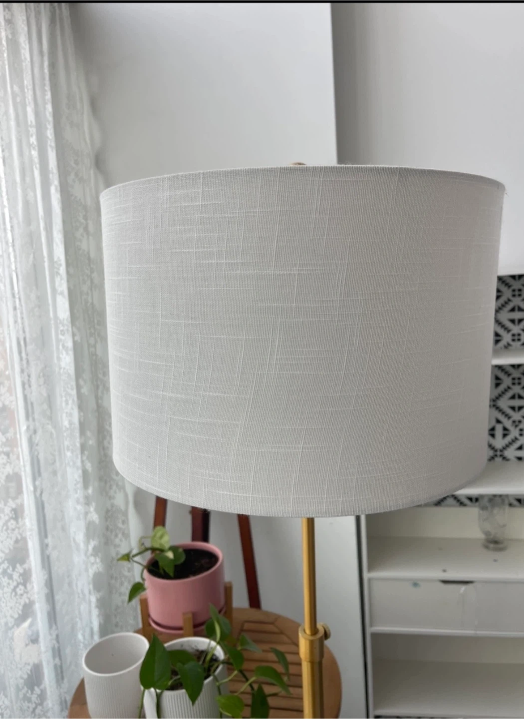 Adjustable height floor lamp. Brass gold metal pole. White marble base. Linen shade. LED bulb included. On/off rotary switch. One lamp is in perfect condition and the second's lamp shade has insignificant traces of paint, visible upon very close up look