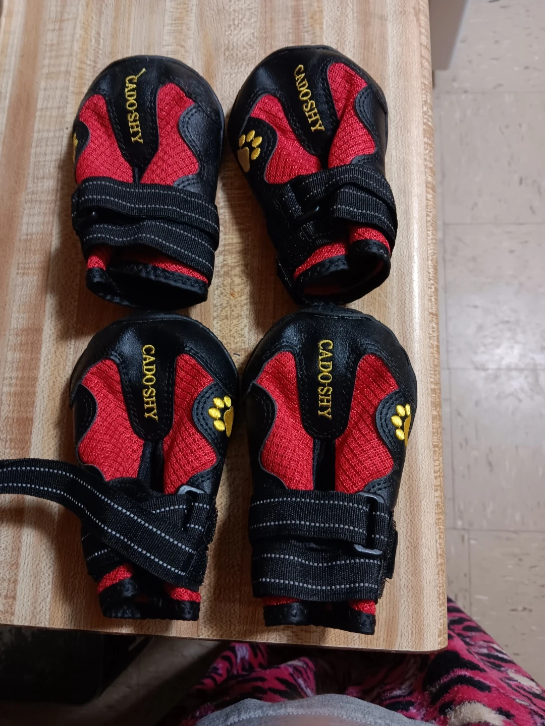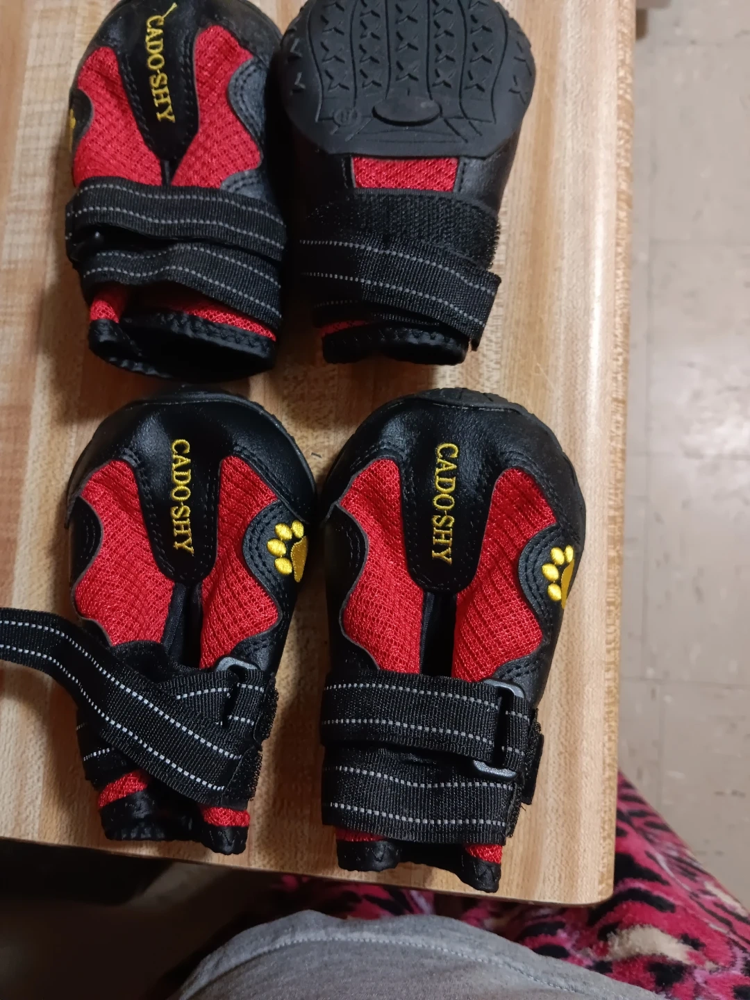 CADOSHY dog boots. Set includes four boots. They're red and black with adjustable straps. The soles are black with tread.