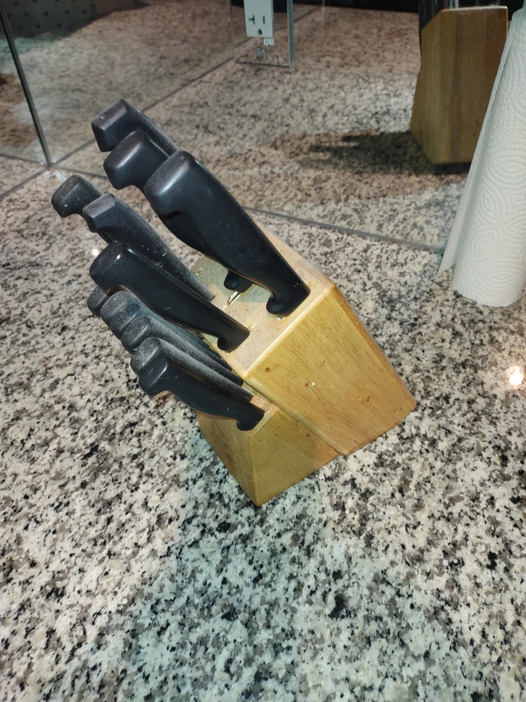 This knife block set includes several knives with black handles and a wooden block. It's a handy kitchen essential for everyday cooking tasks.