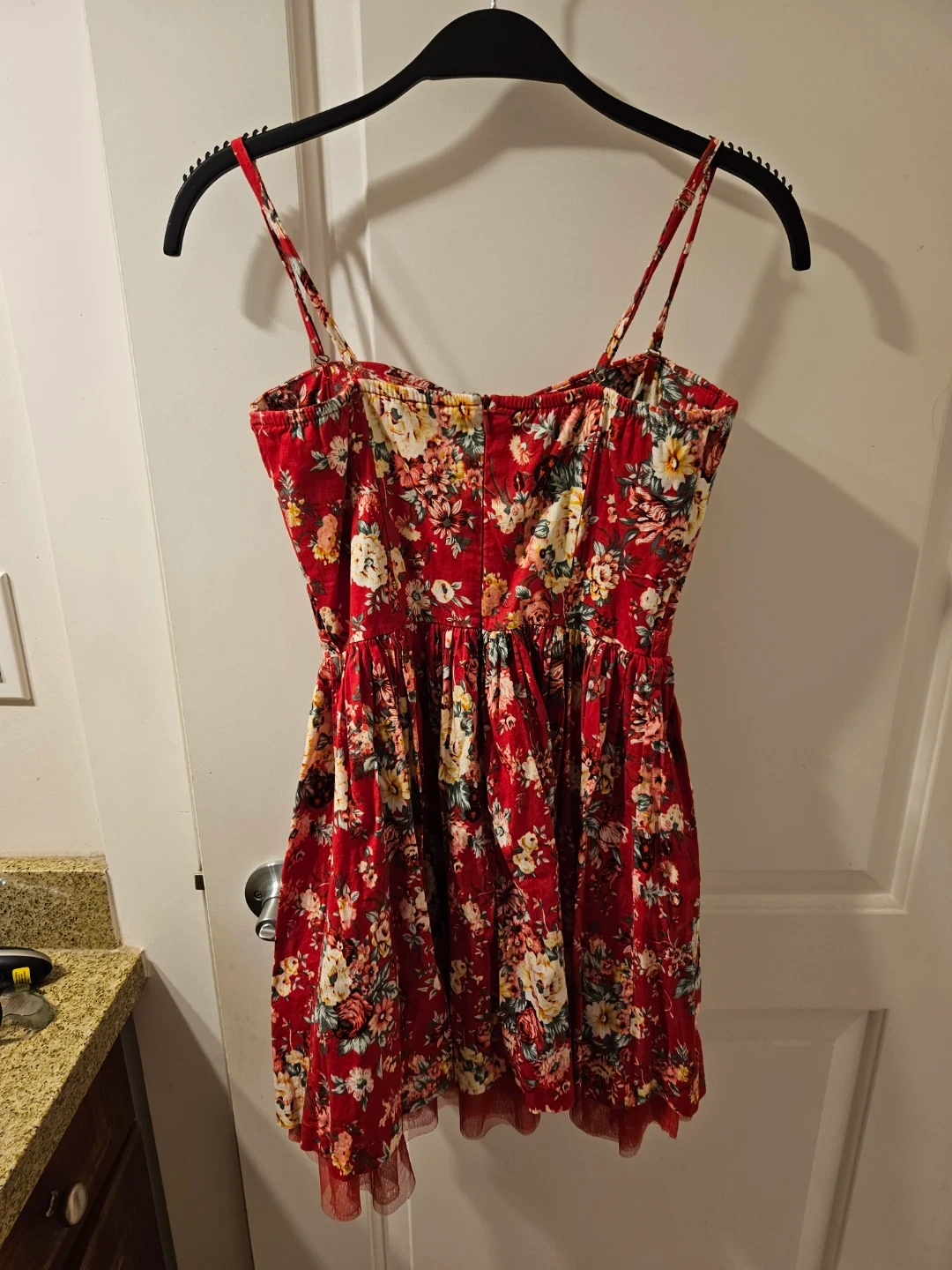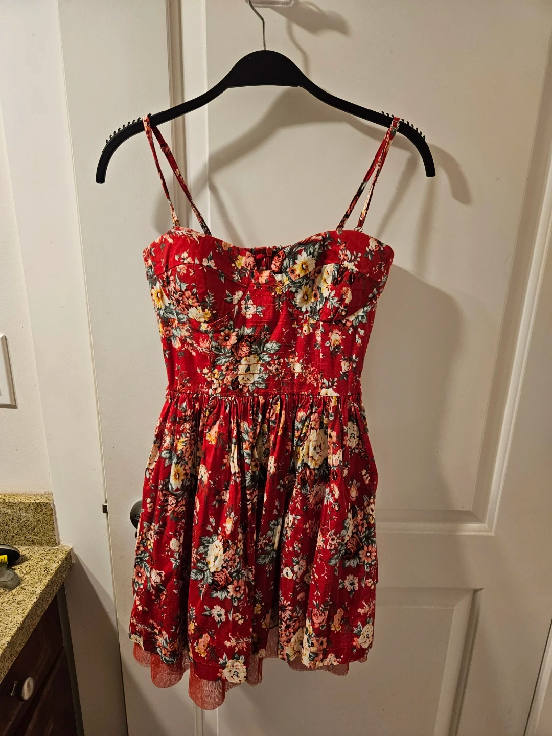 This XXI dress features a vibrant red floral print. It's a size S/P with adjustable spaghetti straps. The skirt has a bit of a flare and a subtle tulle trim.