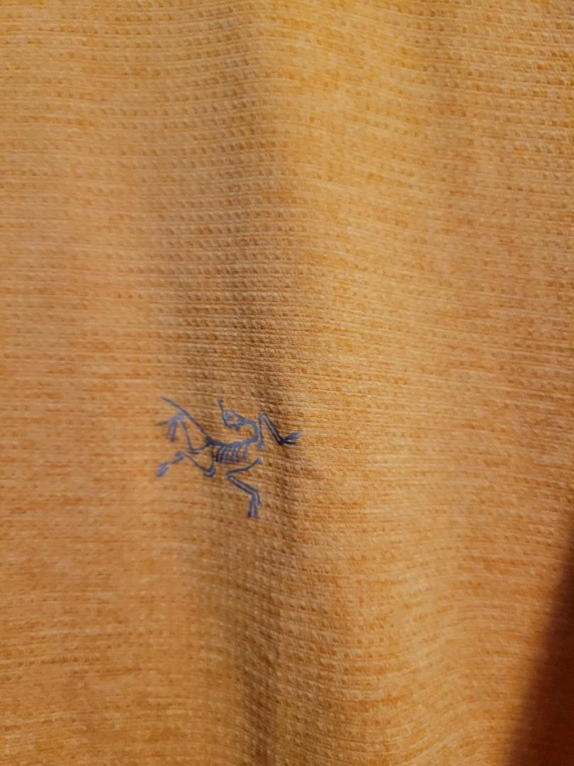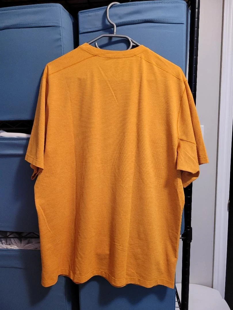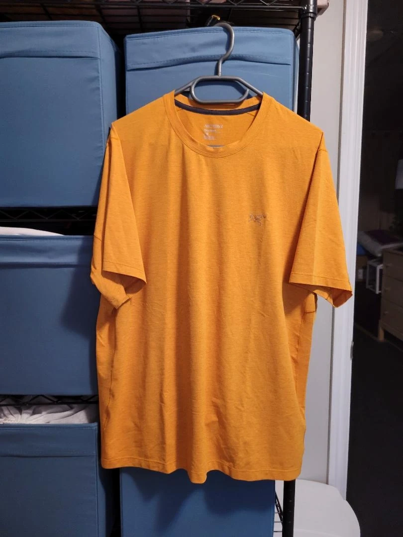 Excellent condition barely used. Arc'teryx short-sleeved t-shirt in a bright orange colour. It's made with a textured fabric. Suitable for outdoor activities or casual wear.