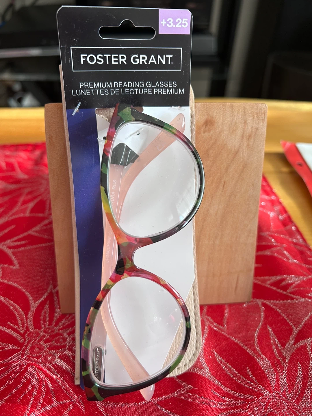Foster Grant premium reading glasses with a strength of +3.25. These glasses have a colourful floral pattern. Includes a protective case. For clear reading.