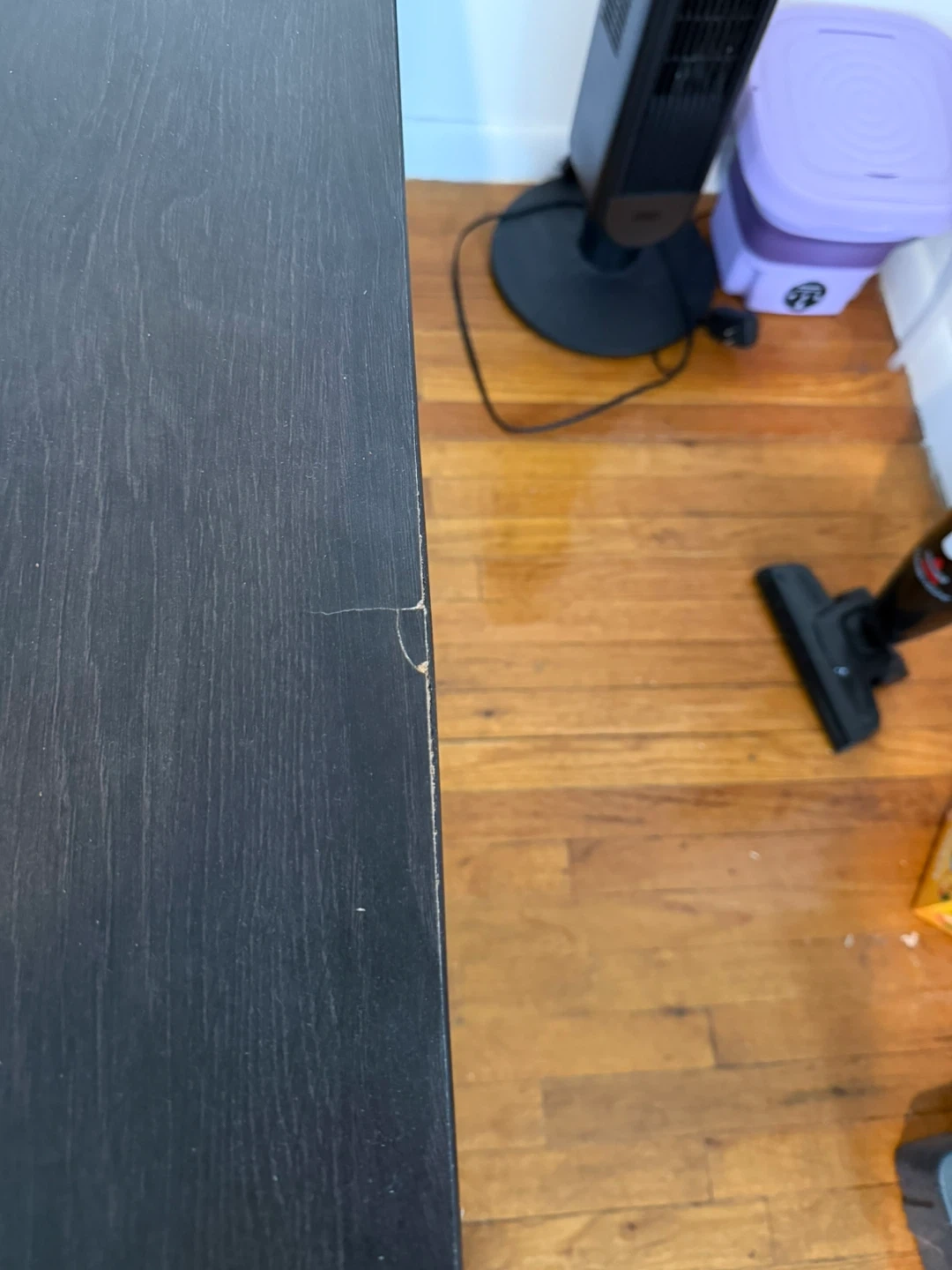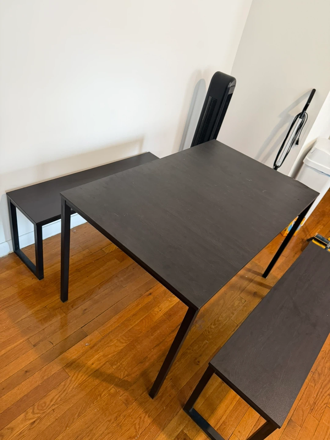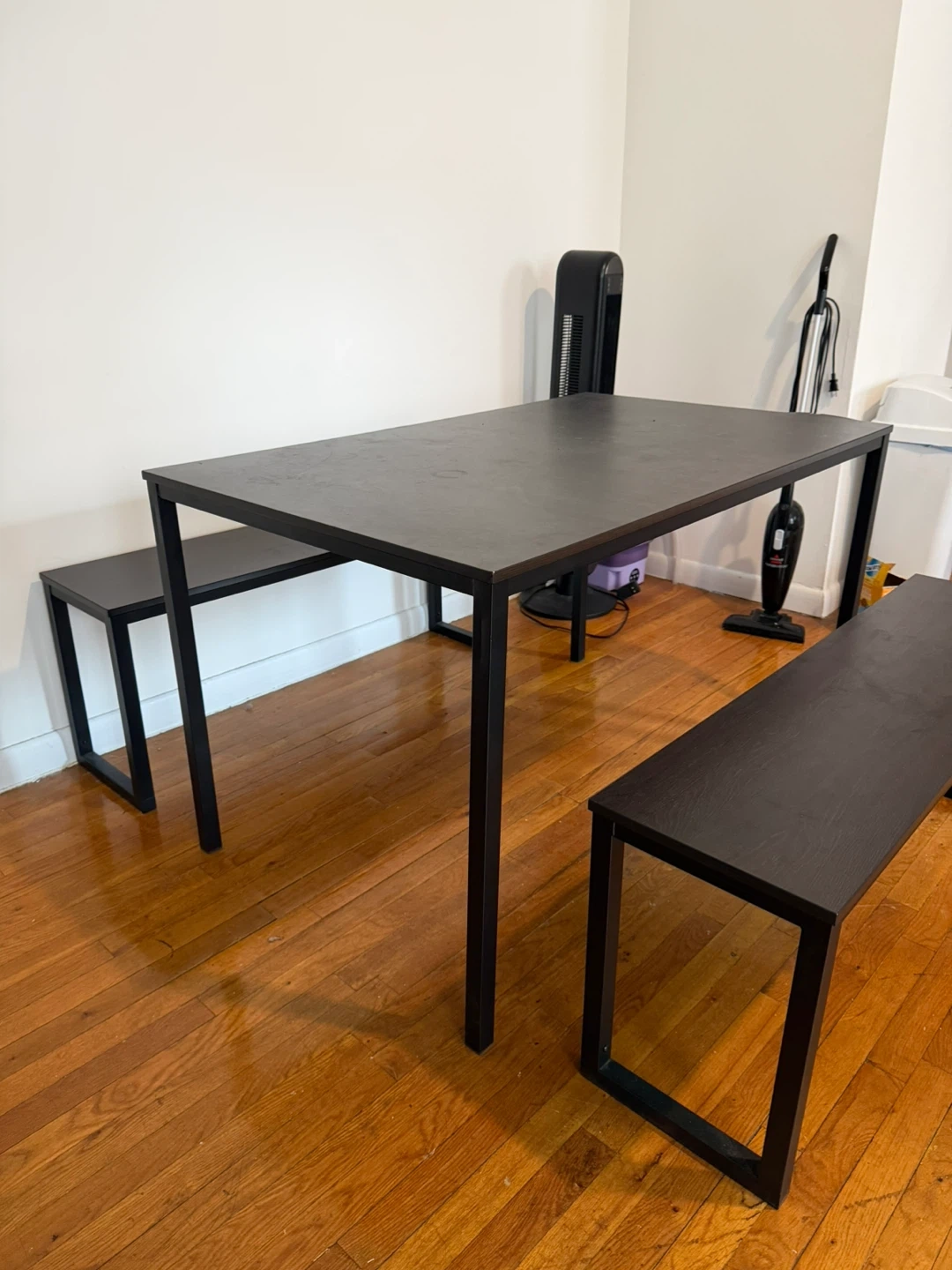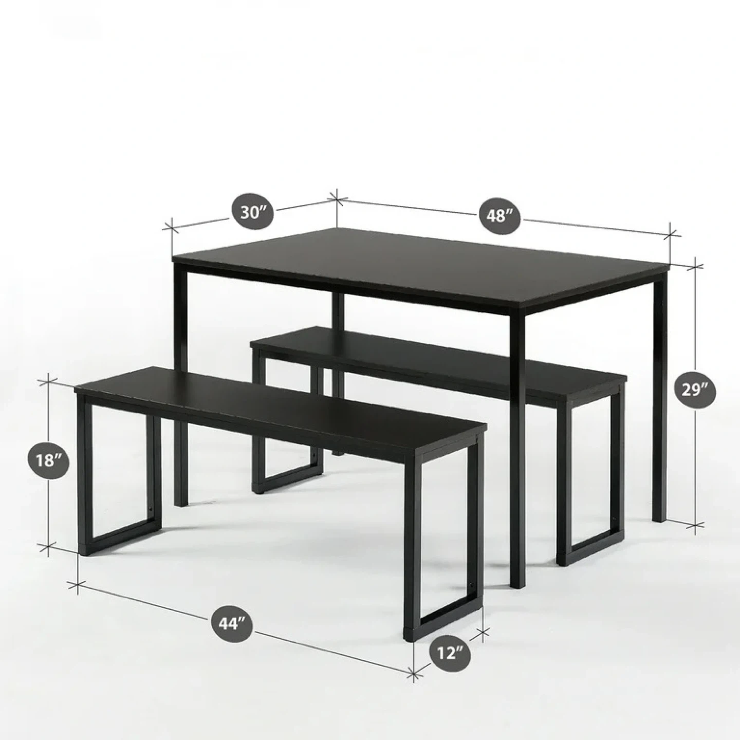 This modern dining set includes one rectangular table and two benches. Table dimensions: 48" L x 30" W x 29" H. Bench dimensions: 44" L x 12" W x 18" H. The tabletop shows a small crack on the edge. It's a compact setup for dining.