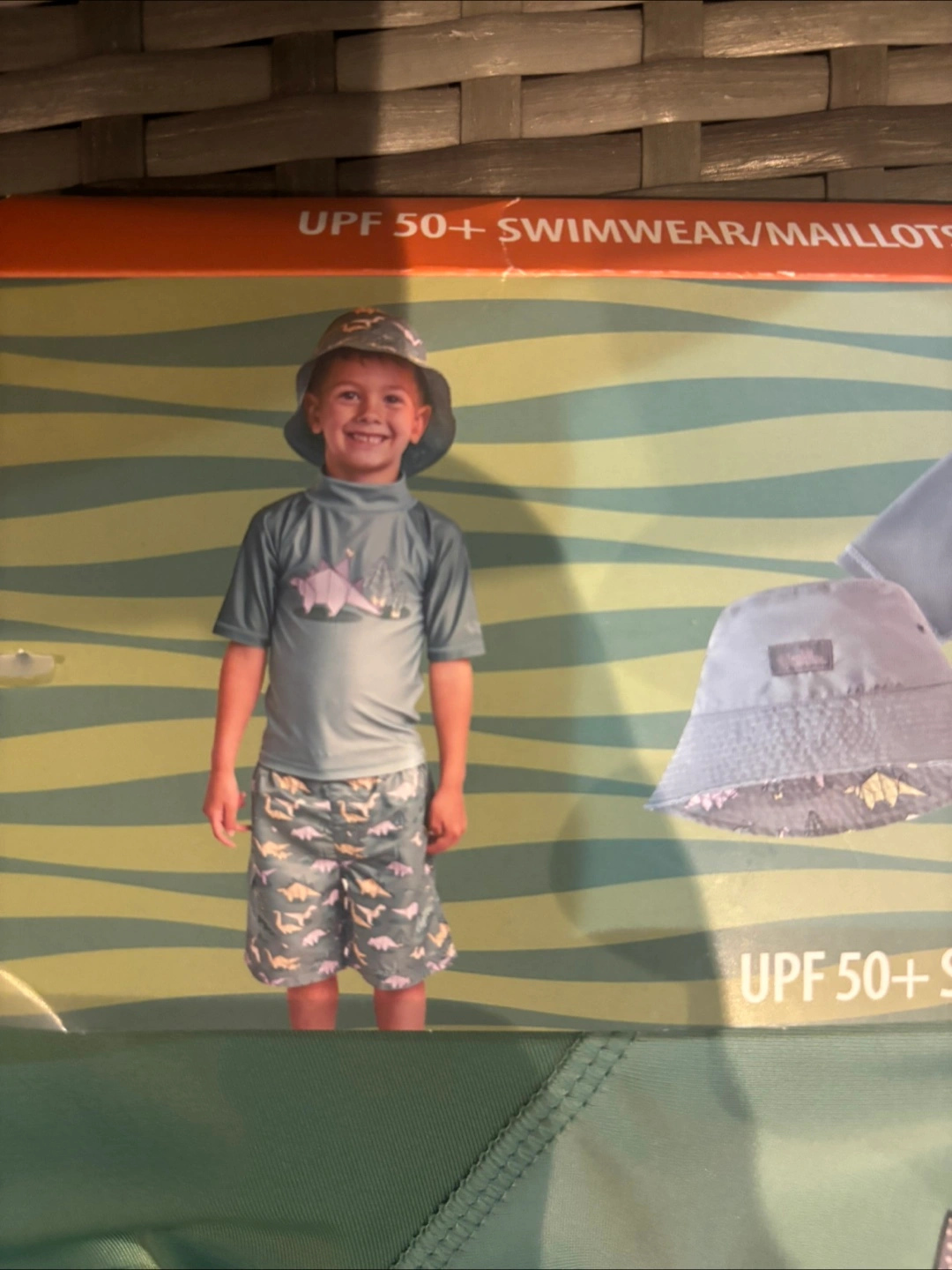 This V. Skinz swimwear set for kids features a UPF 50+ rating. It includes a long-sleeved rash guard and shorts, both with a fun dinosaur print. The set also comes with a matching sun hat. It's perfect for a day at the beach or pool!