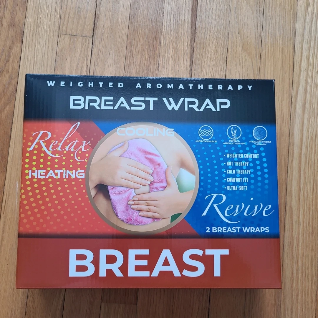 This is a new weighted aromatherapy breast wrap for hot or cold therapy. It's microwaveable, freezer/fridge safe, and made with ultra-soft material. Comfort fit design provides weighted comfort.