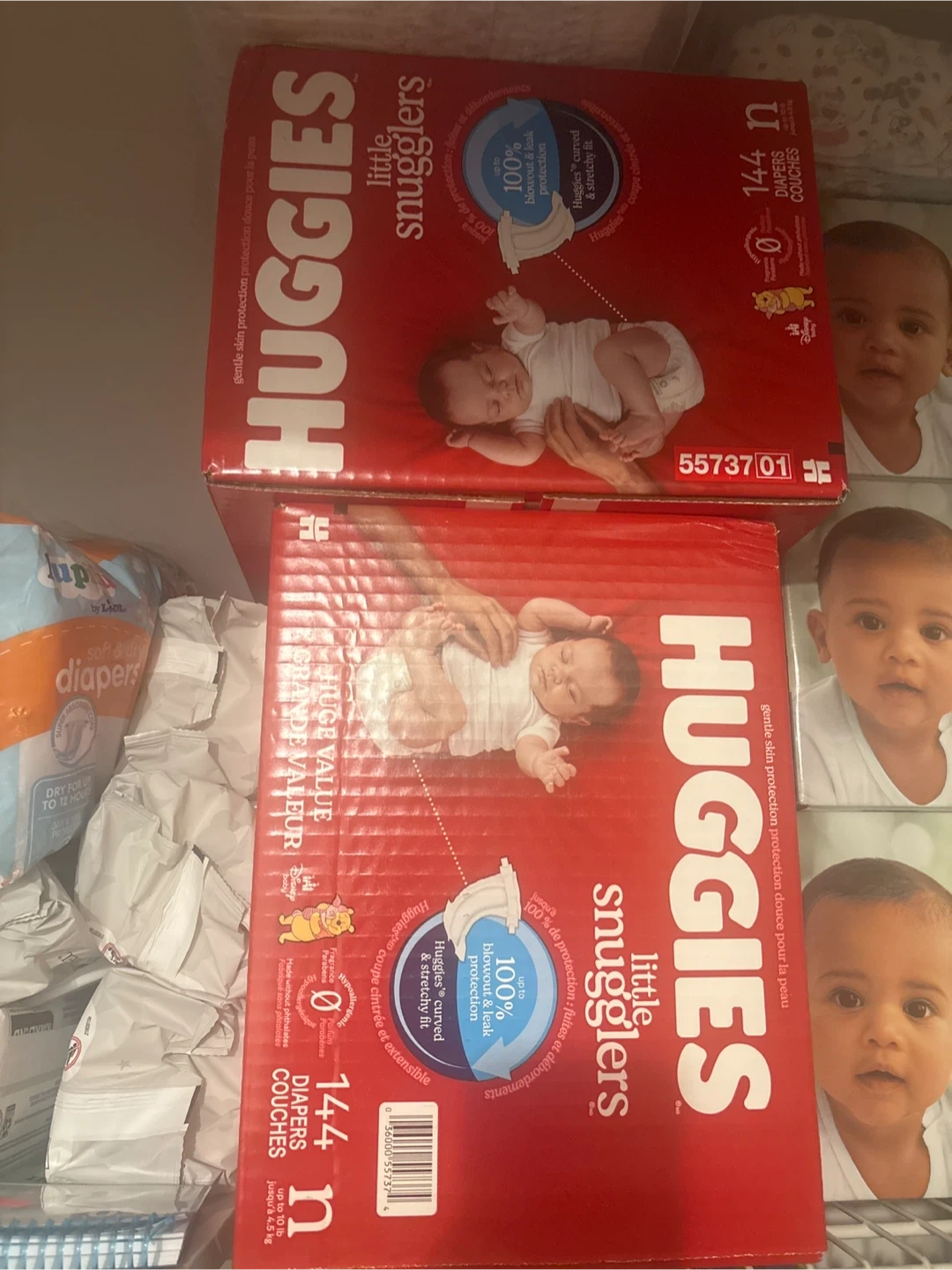 60Selling a box of Huggies Little Snugglers diapers! This is a huge value box, with 144 diapers, size N (up to 10 lb or 4.5 kg). They offer up to 100% blowout and leak protection with a curved and stretchy fit. These diapers are hypoallergenic and made without phthalates