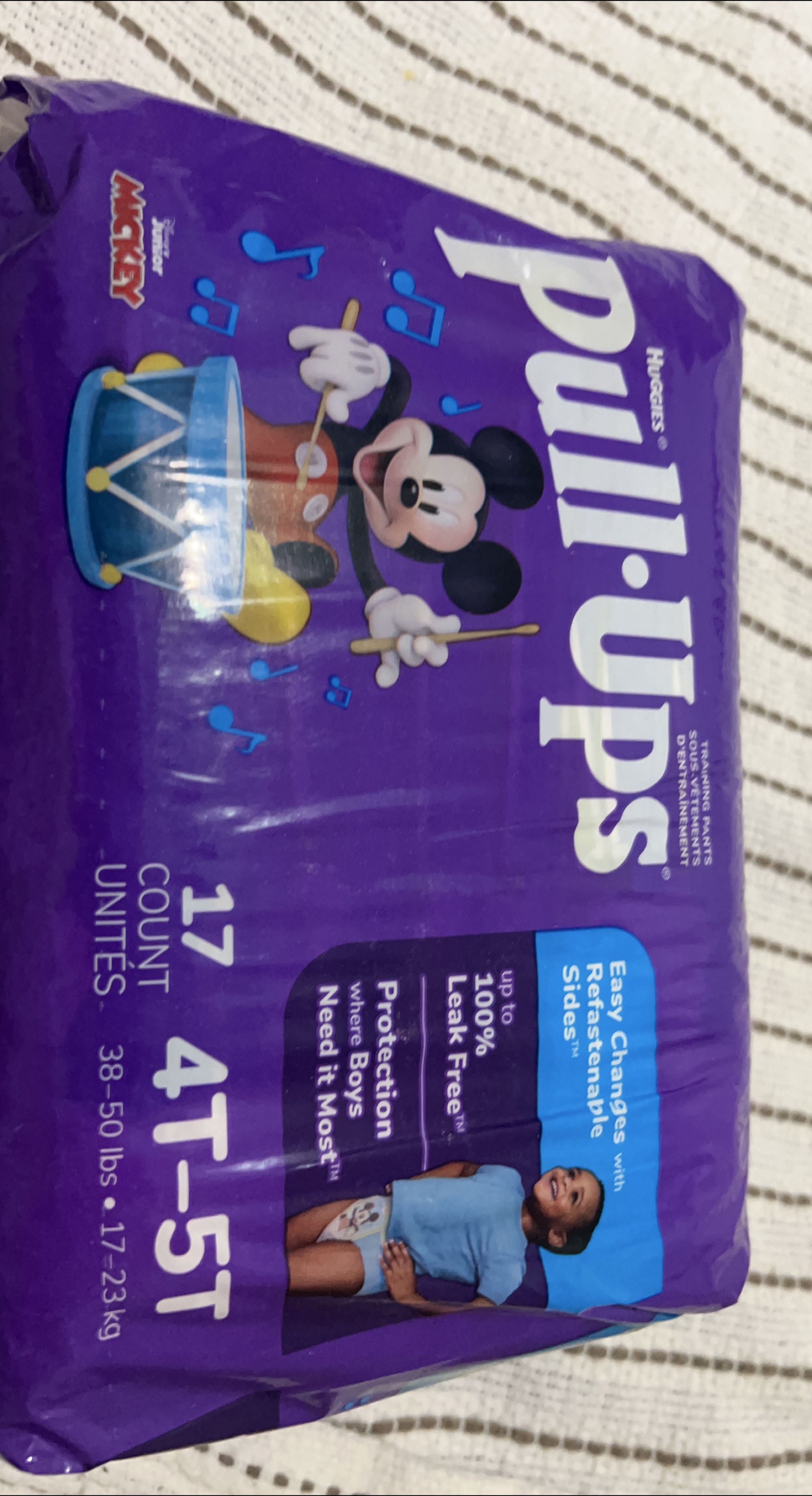 I'm selling a pack of Huggies Pull-Ups training pants. Size: 4T-5T Count: 17 Weight: 38-50 lbs (17-23 kg) These training pants feature easy changes with refastenable sides and up to 100% leak-free protection where boys need it most