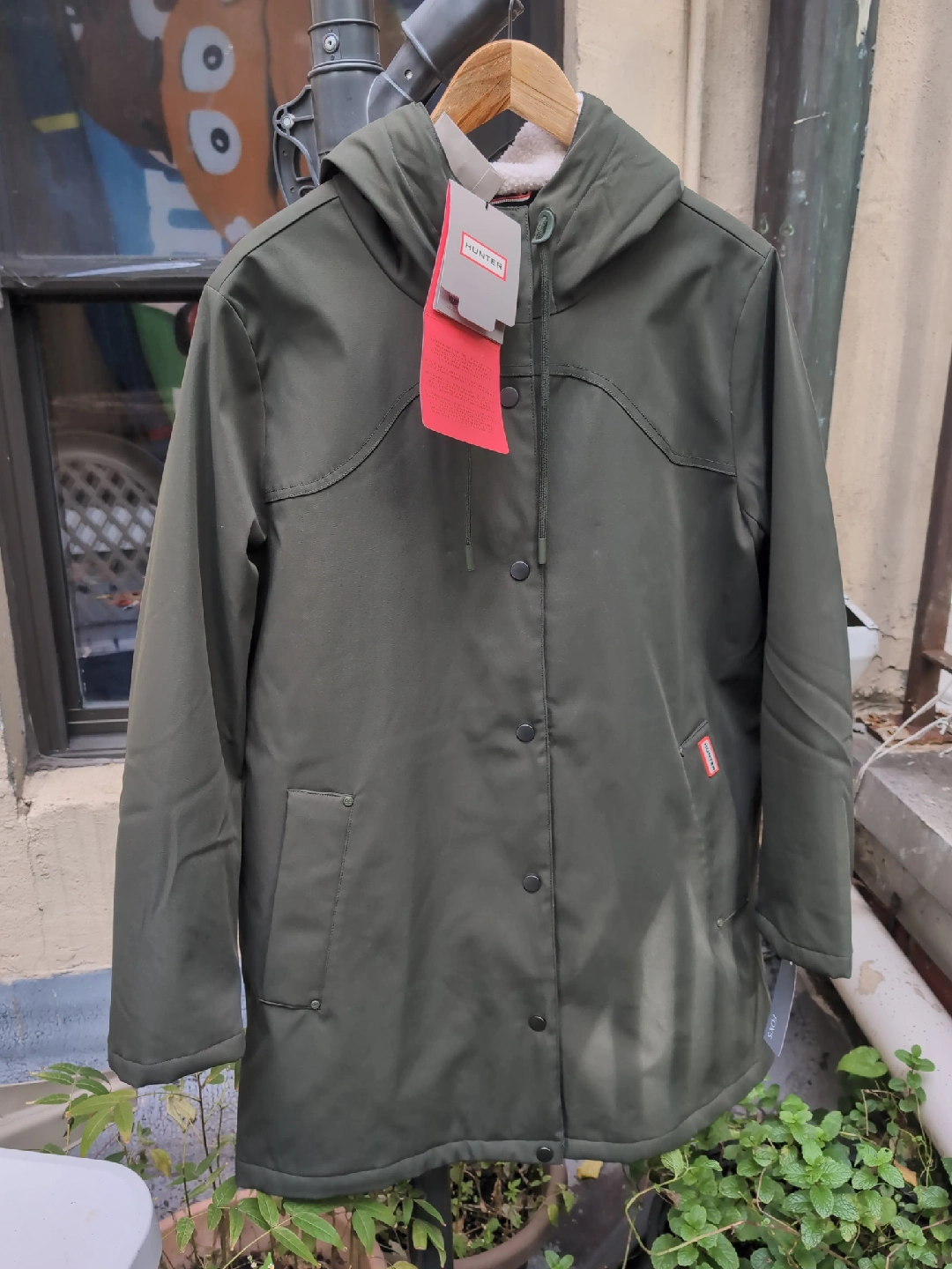 Selling a women's Hunter brand raincoat in a nice dark green color. It's new, soft, warm and very comfortable.