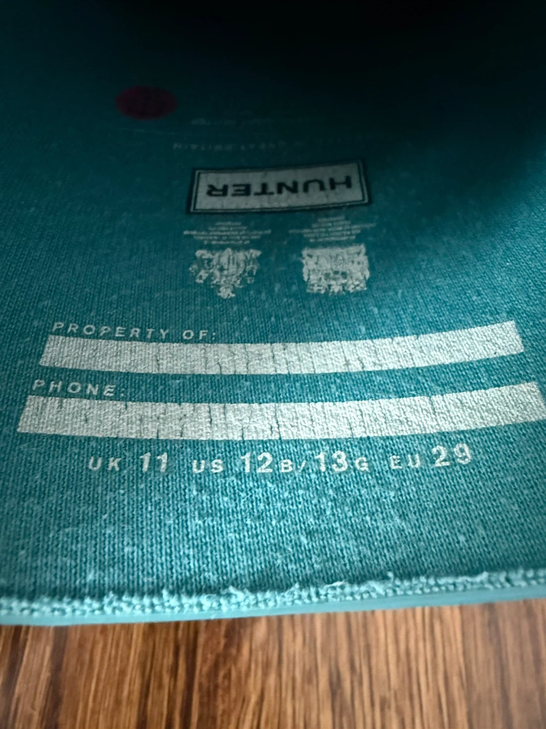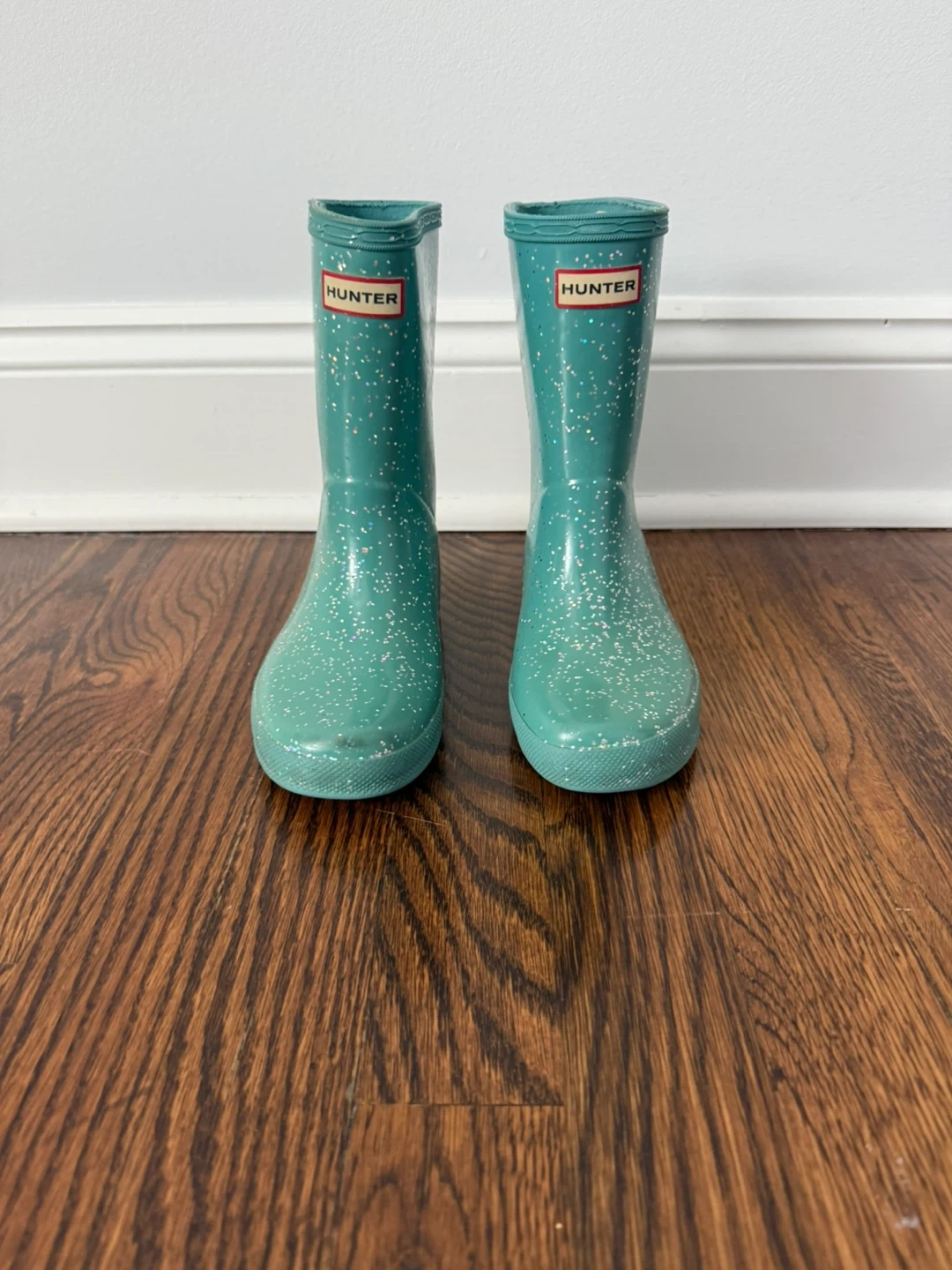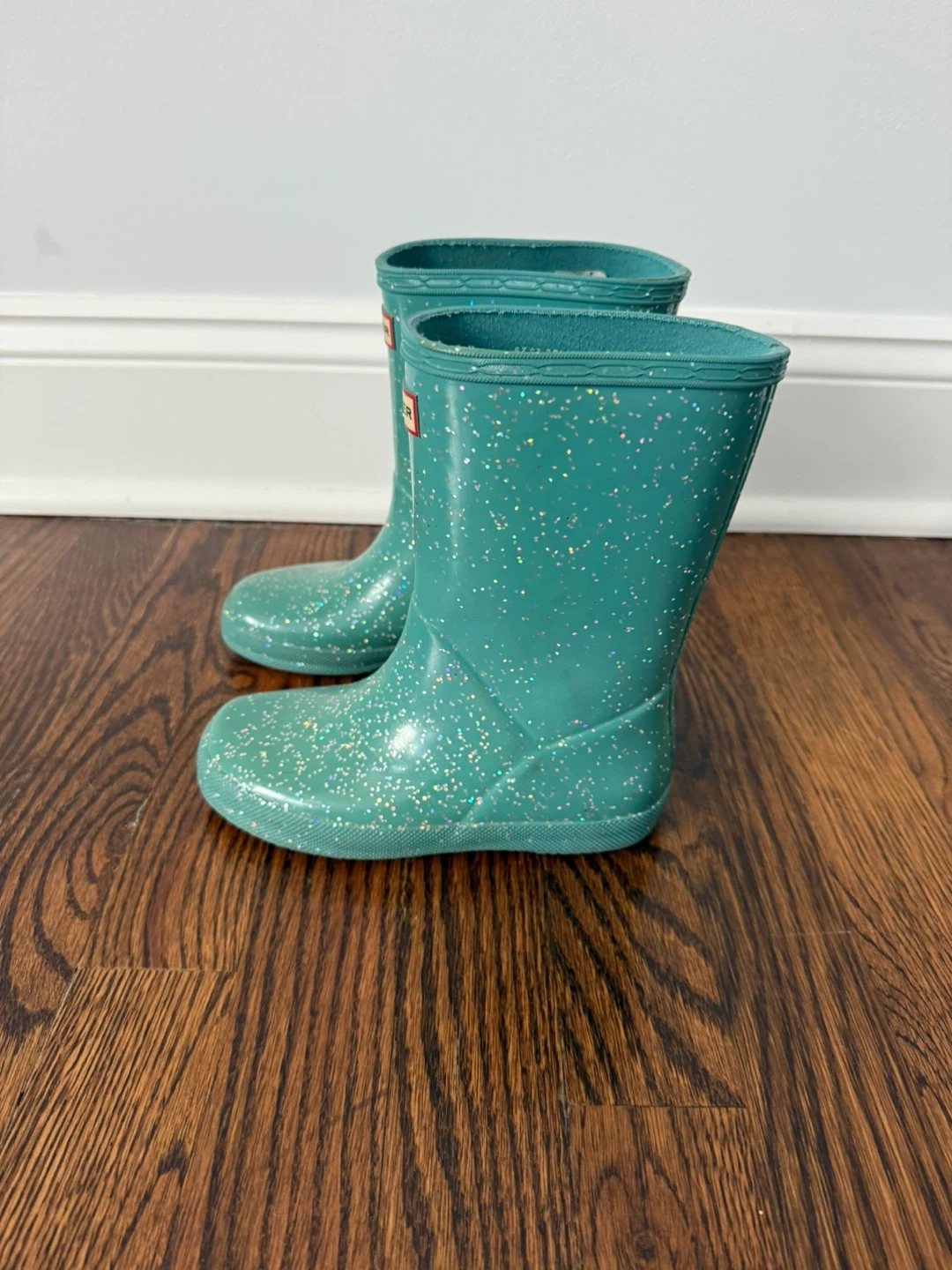 These adorable Hunter Kids First Glitter Rain Boots are in good condition! They're a fun teal color with a glittery finish. The size is US 12/13.