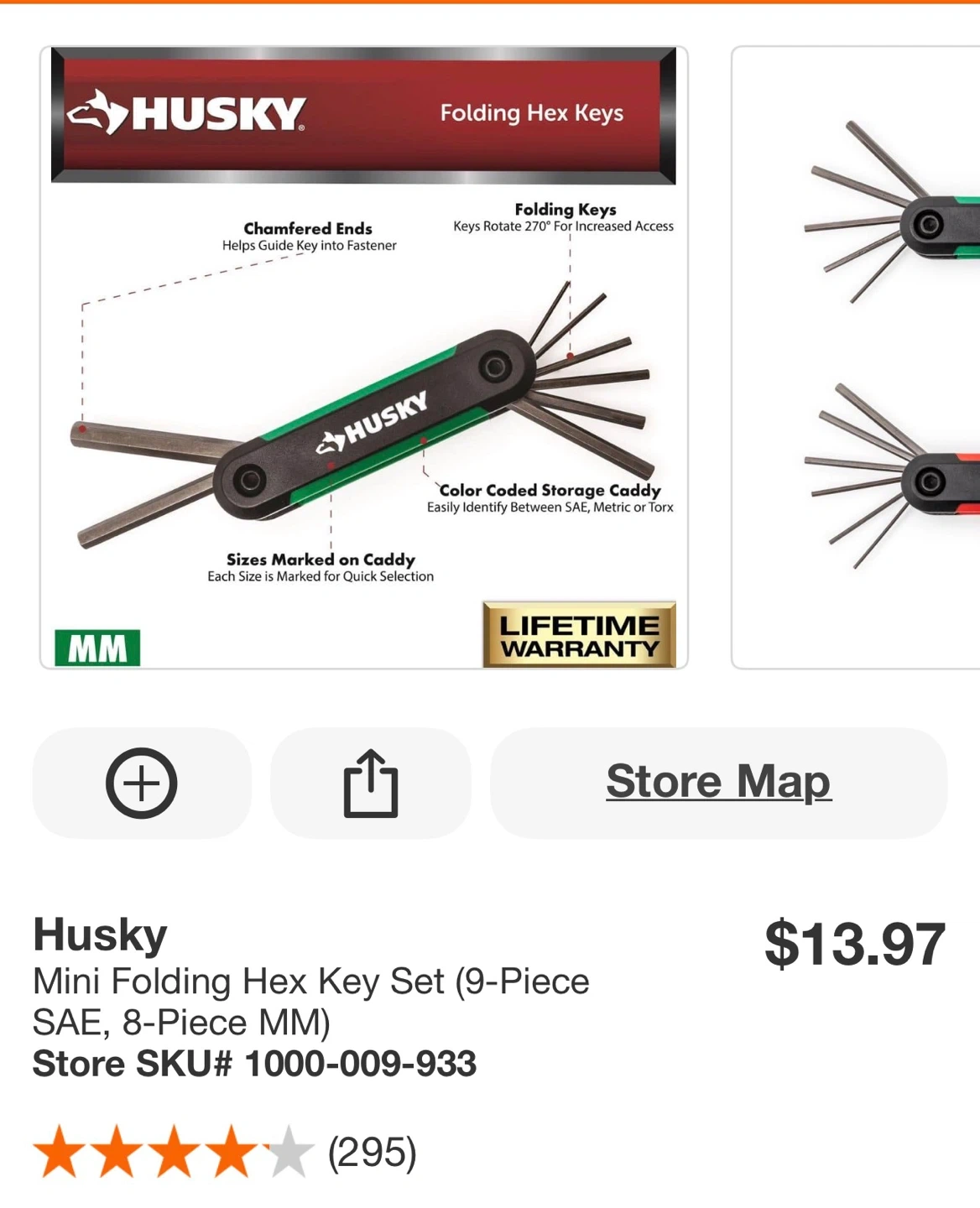 Selling a Husky mini folding hex key set. It features a color-coded storage caddy for easy identification between SAE, metric, or Torx. The folding keys rotate 270° for increased access, and the sizes are marked on the caddy for quick selection