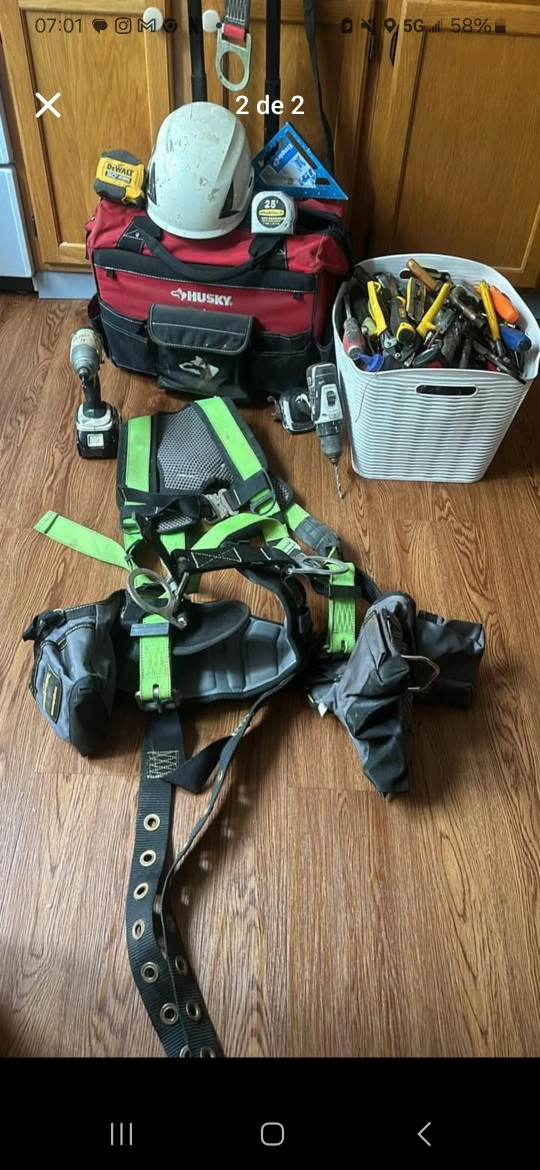 15I have a Husky tool bag, tool belt, a white safety helmet, and a basket of tools for sale. The tool bag is red and black and the tool belt is green and black.