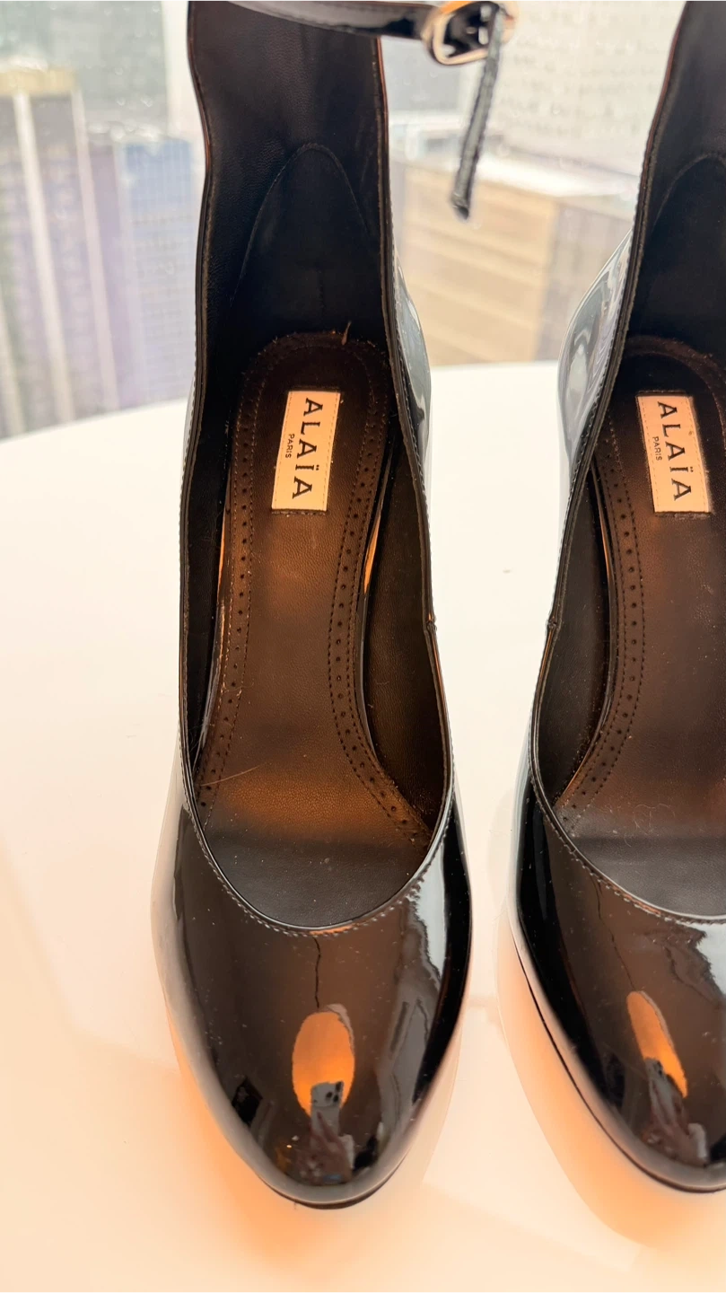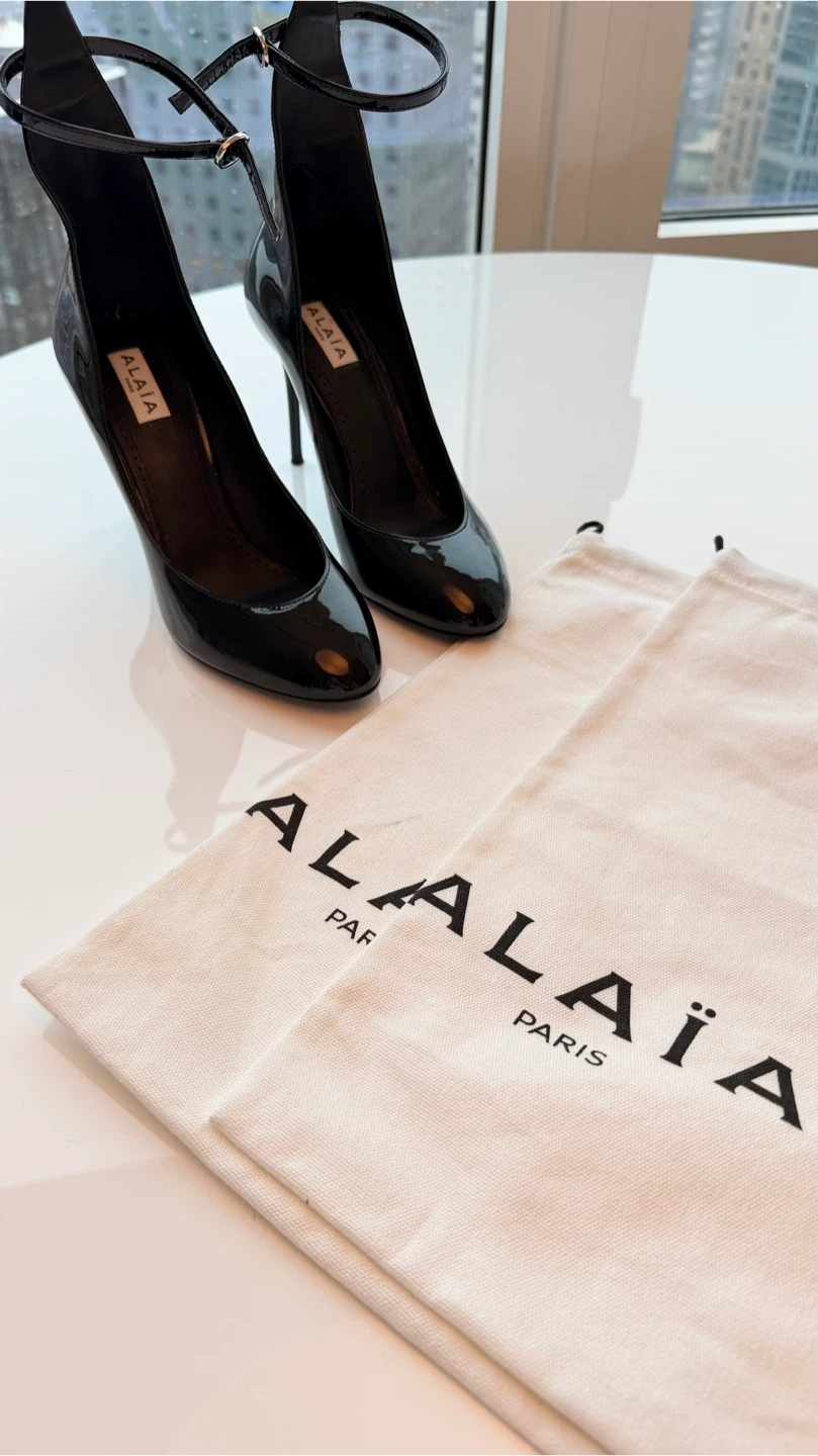 Authentic ALAÏA Paris black patent leather pumps with delicate ankle strap and elegant stiletto heel.