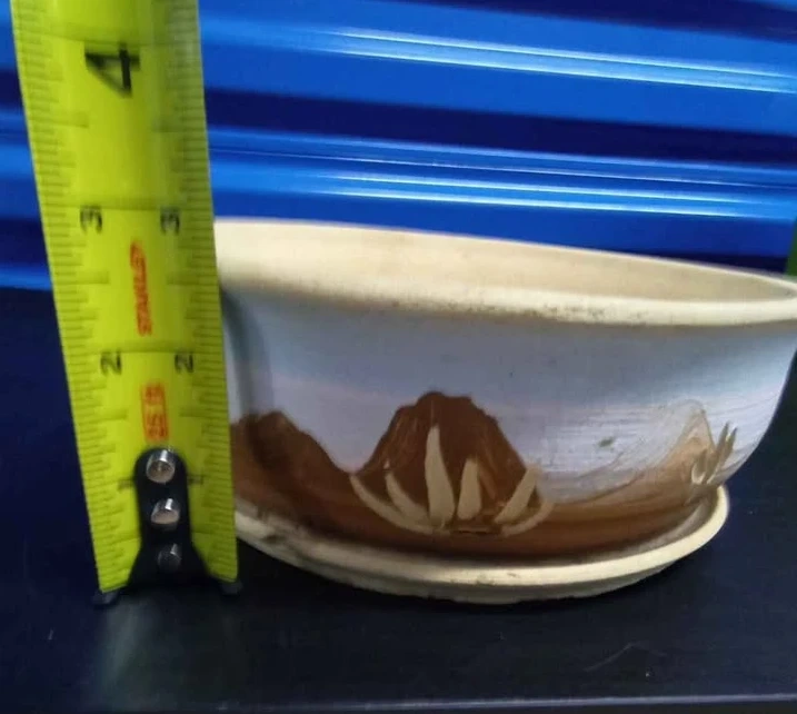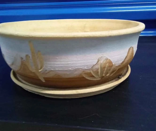 Terracotta planter pot with decorative landscape design. Includes matching saucer. Approx. 7" in diameter and 4" tall. Some dirt residue inside. Great for indoor or outdoor plants!