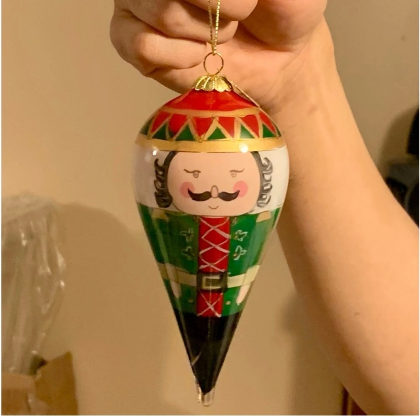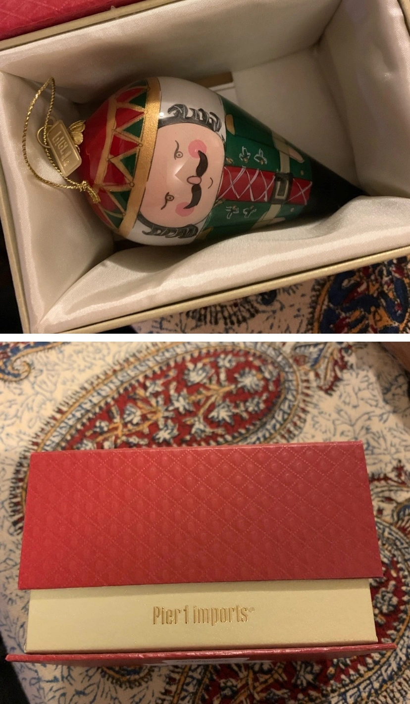 A beautiful glass ornament featuring a nutcracker. It is in a red box with the Pier 1 Imports logo. It comes with a gold string for hanging. It is a unique and festive addition to any Christmas tree or holiday decor. The ornament has a shiny, glossy finish that adds to its charm.