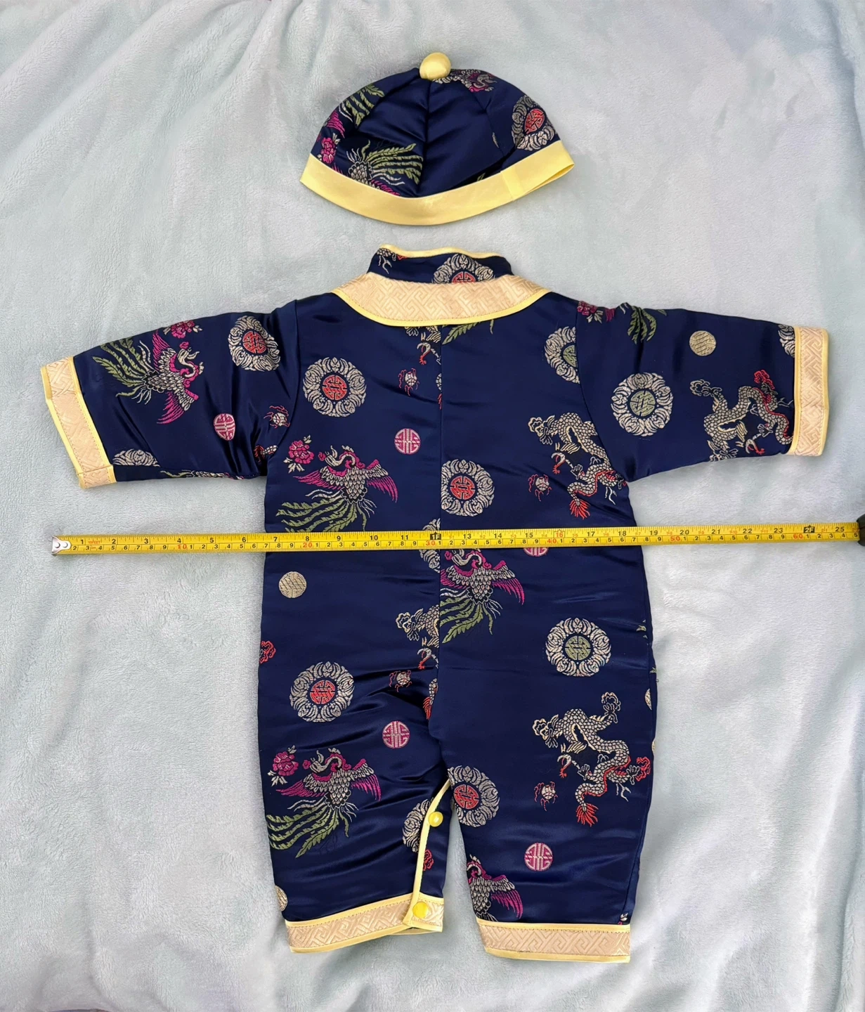 This adorable silk,and cotton padded romper features a traditional beautiful Chinese dragon and phoenix print. It's a two-piece set, including a matching hat. Snaps closure on the front and at the crotch for easy dressing. Measures approximately 17 inches long from shoulder to hem, and 11 inches wide across the chest. Ideal outfit for the Chinese New Year and winter season.