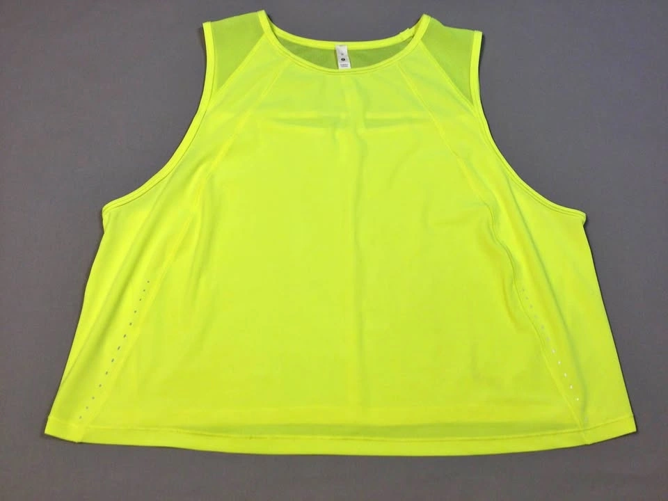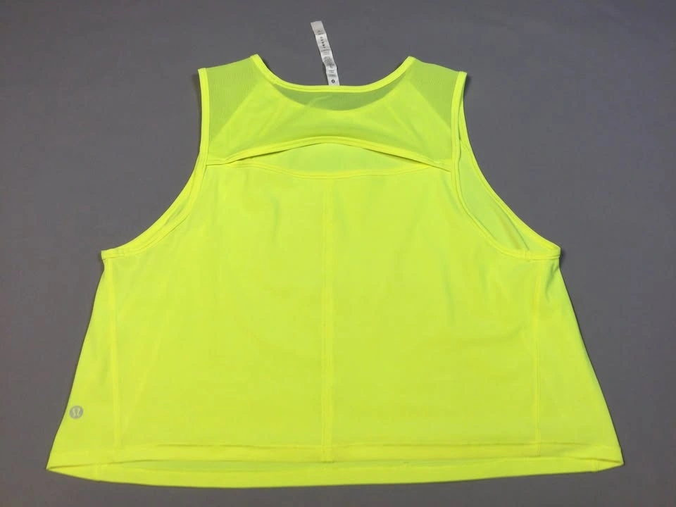 Vibrant Lululemon athletic tank. Size 16. Neon yellow color. Mesh panels on shoulders and upper back. Has a cutout design on the back. Small reflective dots on side seams. Cash only, public meetup in Manhattan / Hell's Kitchen.