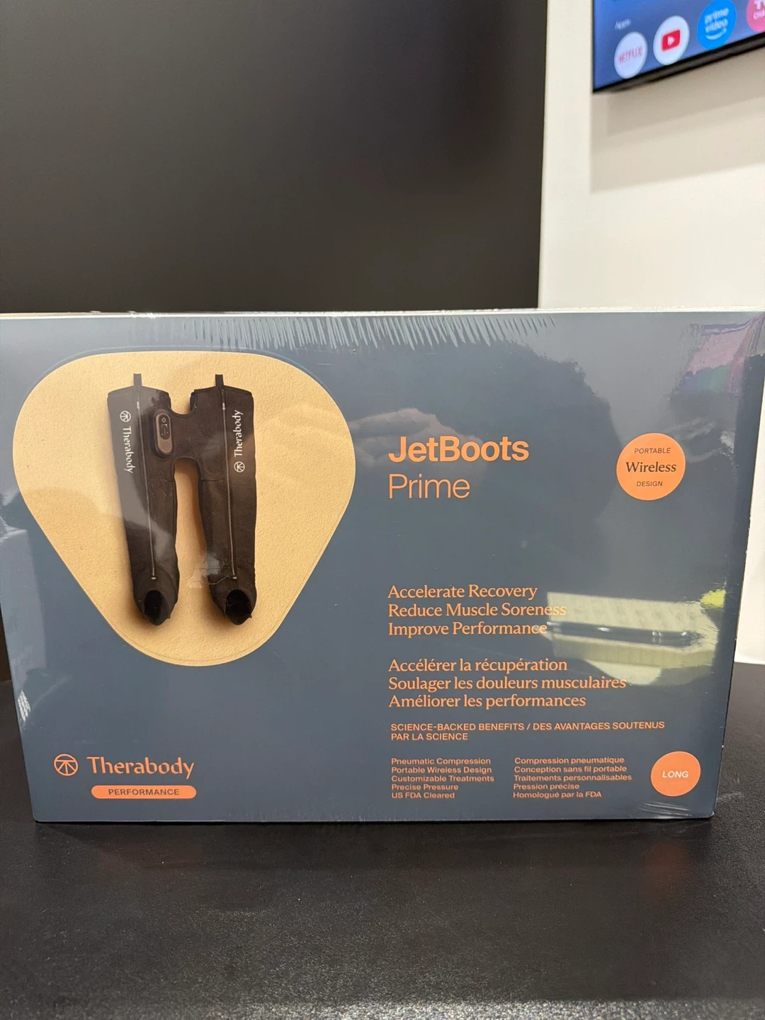 Therabody JetBoots Prime system for accelerating recovery and reducing muscle soreness. It features pneumatic compression, a portable wireless design, and customizable treatments.