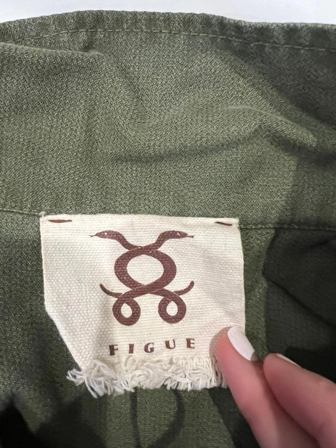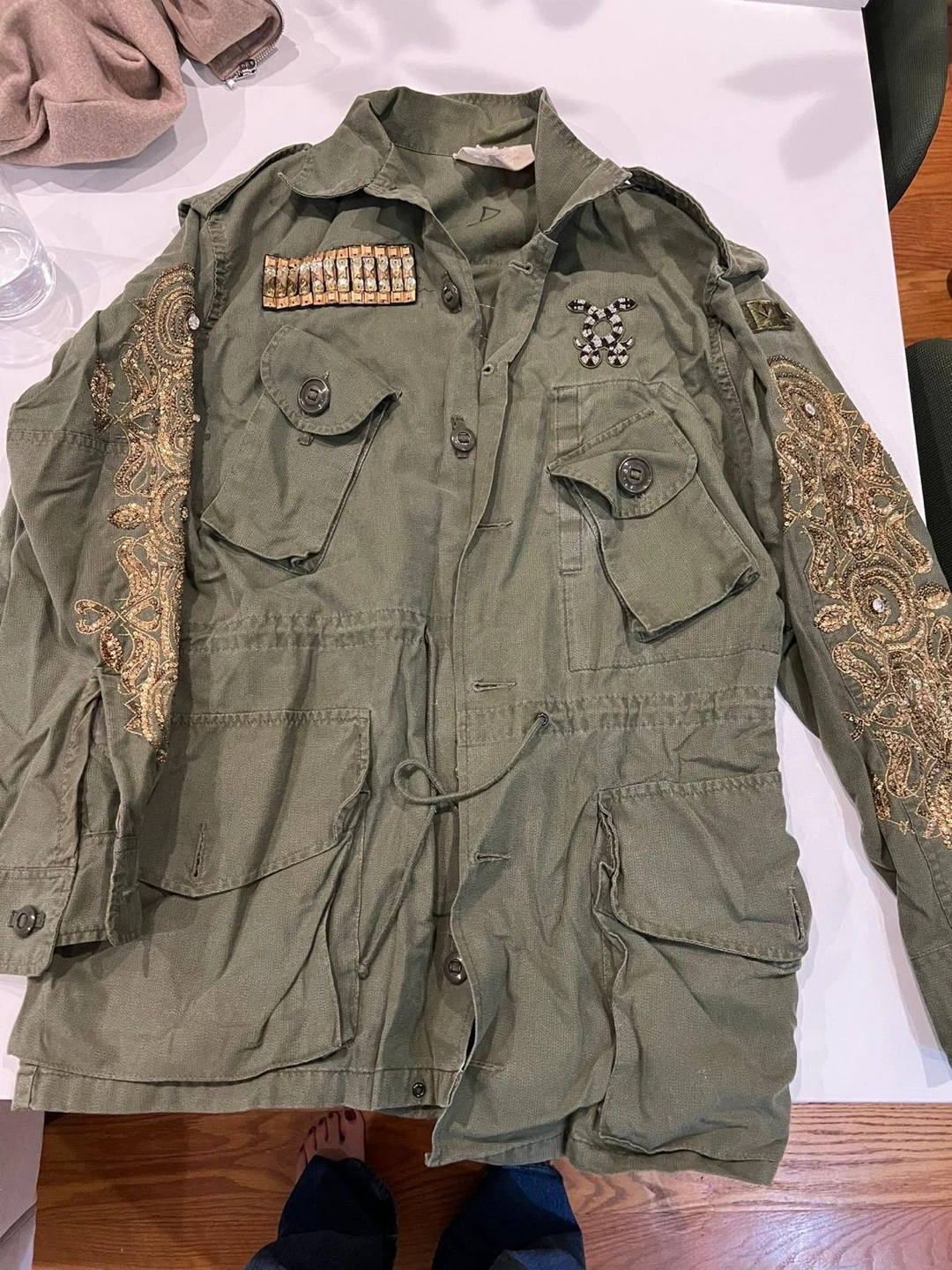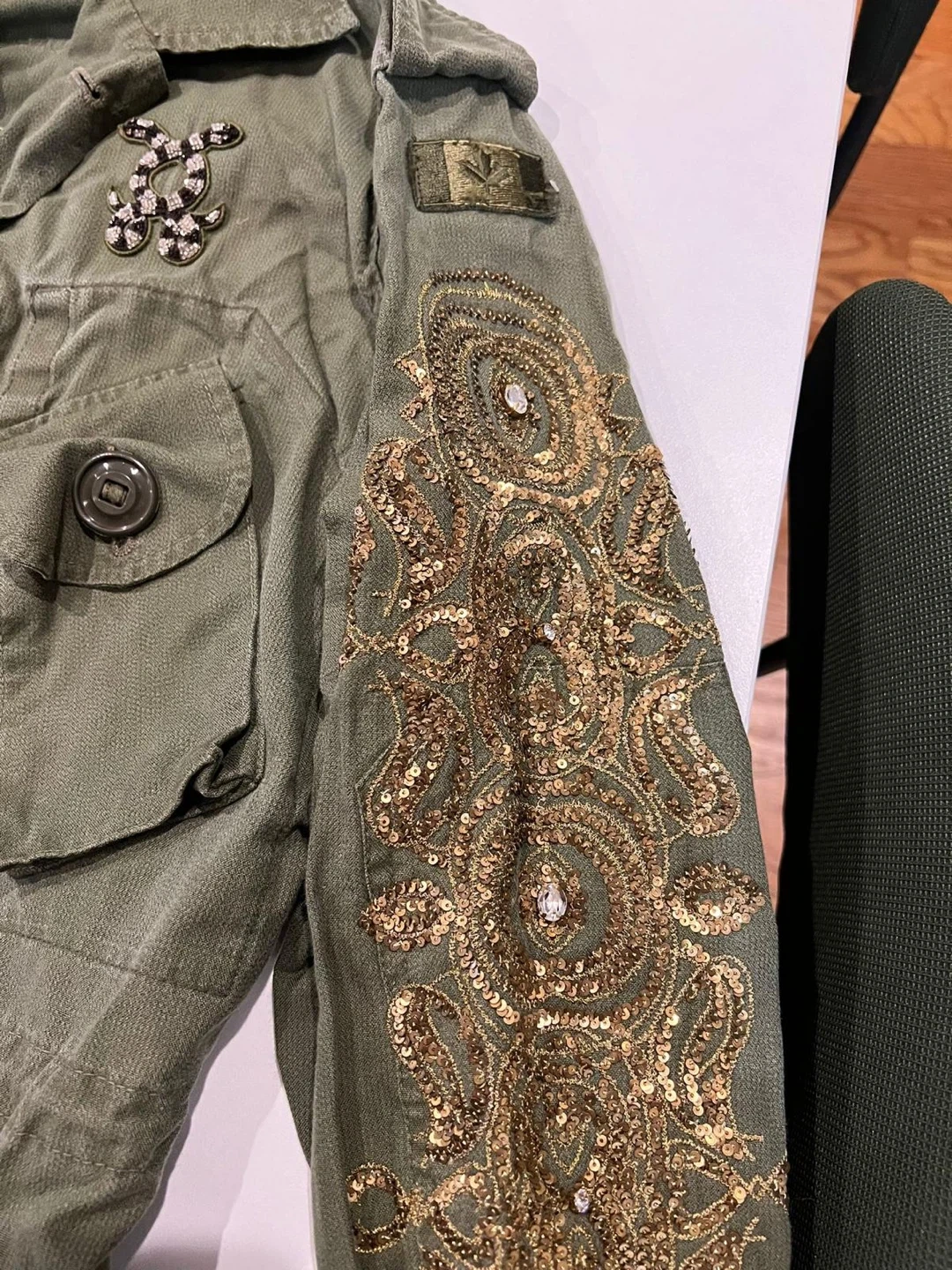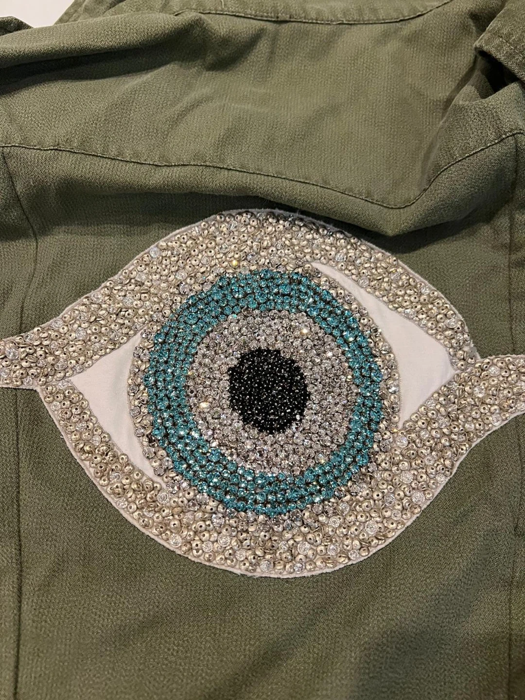 Embellished olive green utility jacket from FIGUE. It features intricate gold embroidery and sequin detailing on the sleeves. There's also a large sequined eye design on the back and decorative patches on the front. Material is a durable cotton blend.
