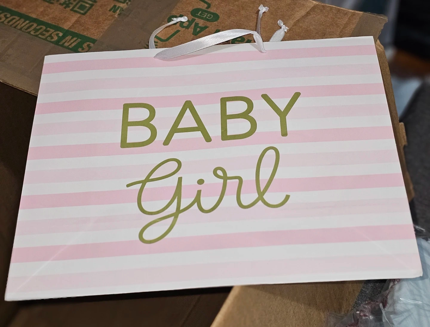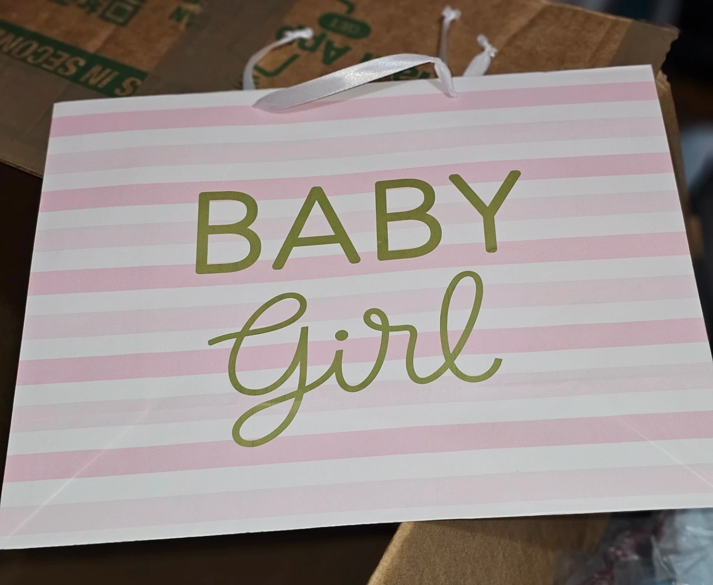 This is a cute gift bag designed for a baby girl. It features pink and white stripes with gold lettering. It has ribbon handles for easy carrying. Perfect for baby shower gift bag