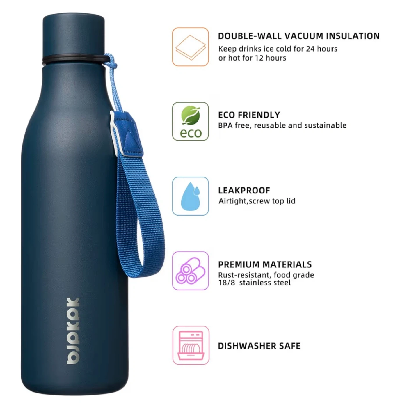 Leak-Proof & Portable: Screw cap designed with a tight seal to prevent leaks and spills, so you can have peace of mind while you're on the go! The compact size makes it easy to put in your backpack or car cupholder, and the carrying strap ensures that you can take it with you wherever you go.