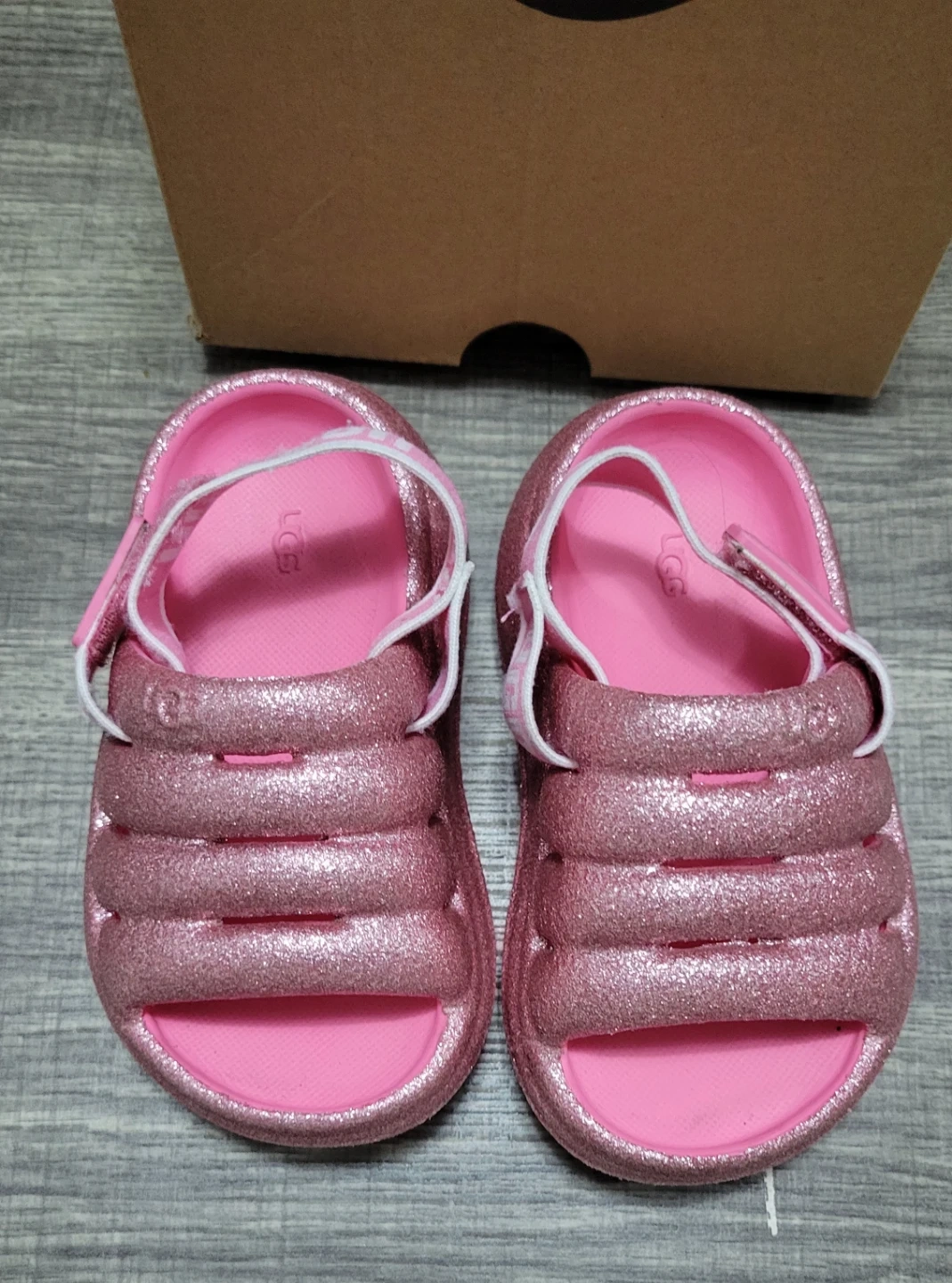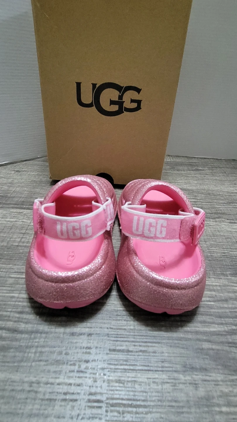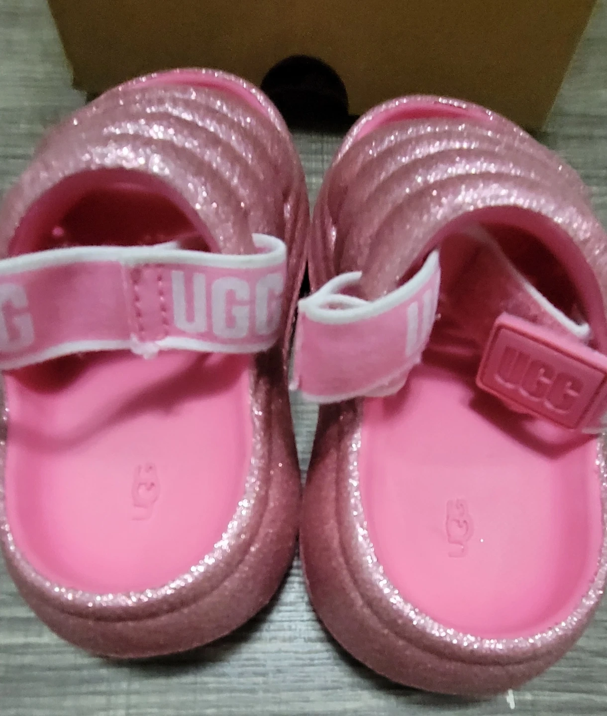 These UGG sandals are a sparkly pink with glitter accents. They feature adjustable hook-and-loop straps for a secure fit. Includes the original UGG box. Size is toddler 6.