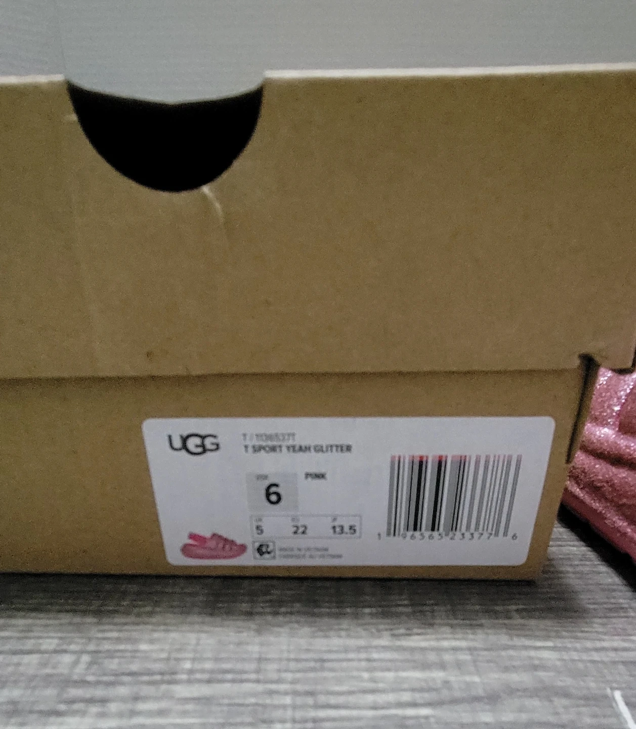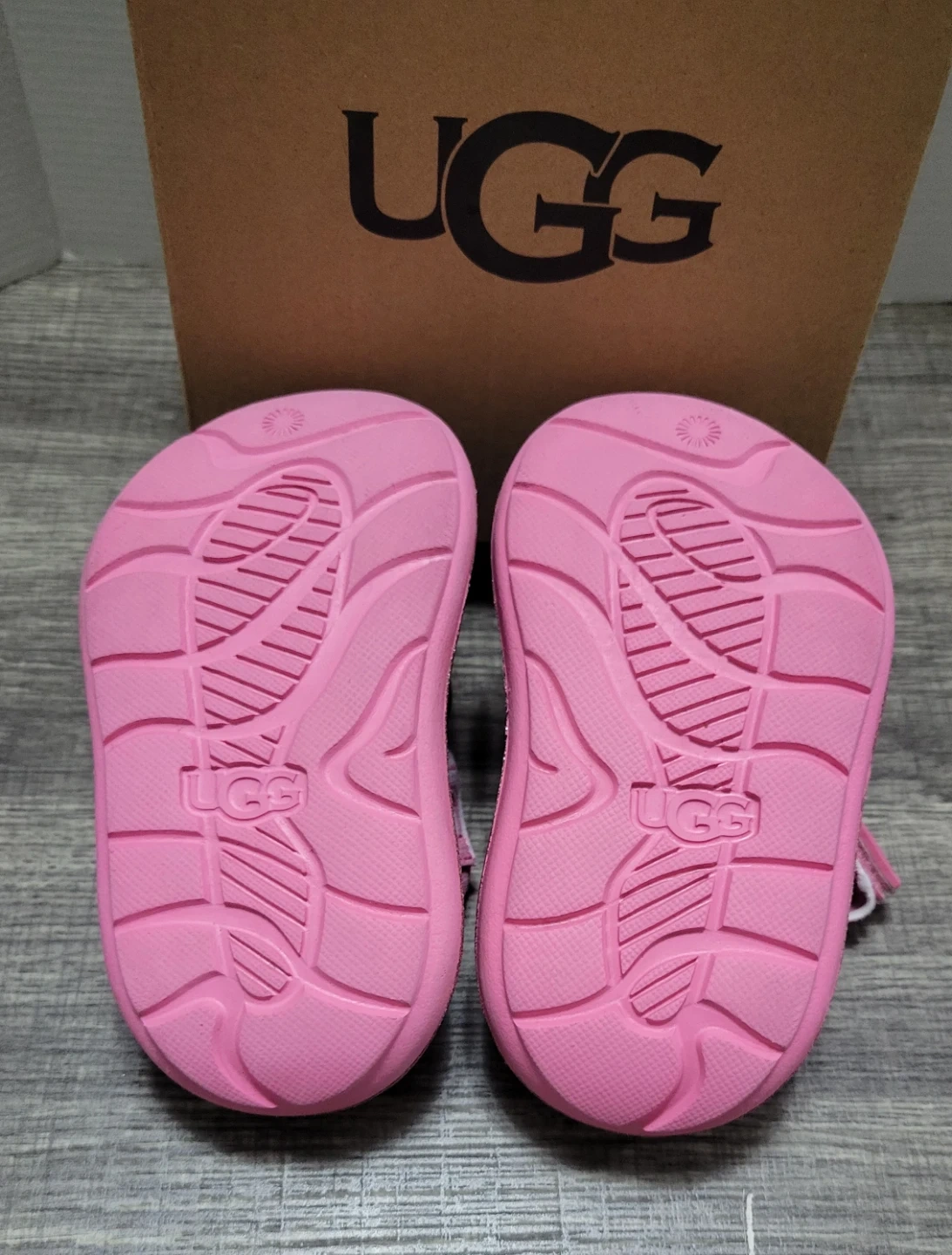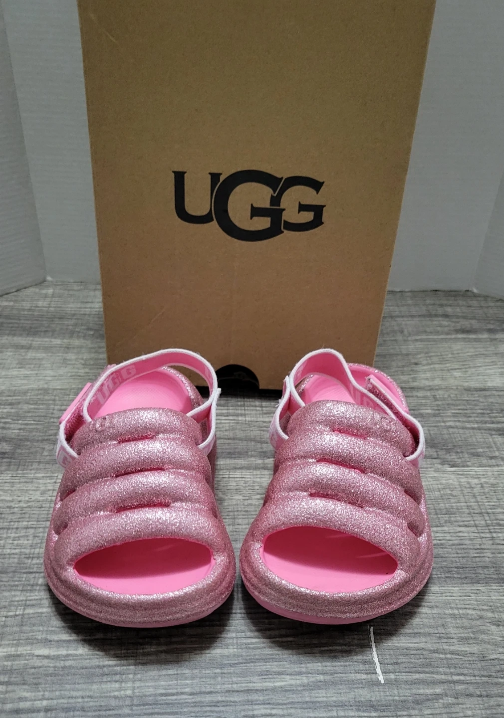 These UGG sandals are a sparkly pink with glitter accents. They feature adjustable hook-and-loop straps for a secure fit. Includes the original UGG box. Size is toddler 6.