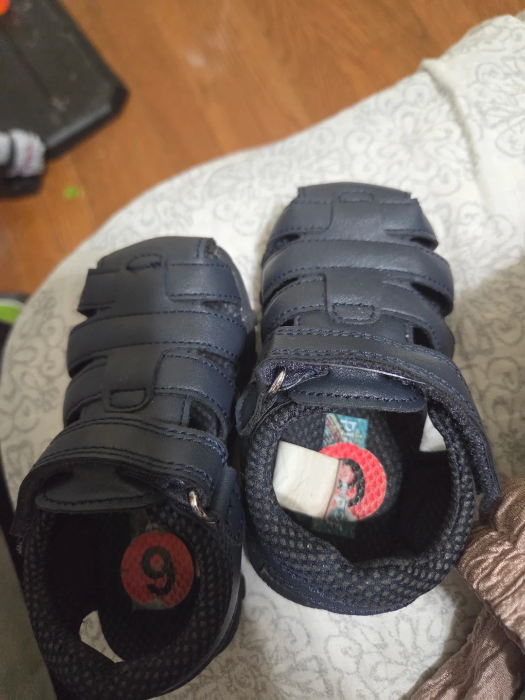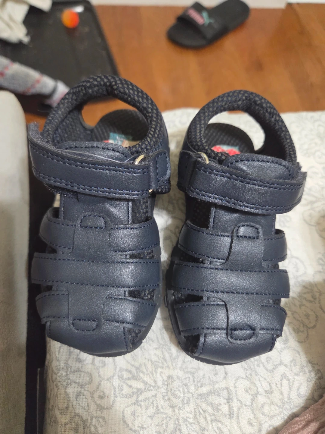 Toddler sandals in a navy blue color. The adjustable hook-and-loop straps ensure a secure fit. Size 6 is printed on the sole.