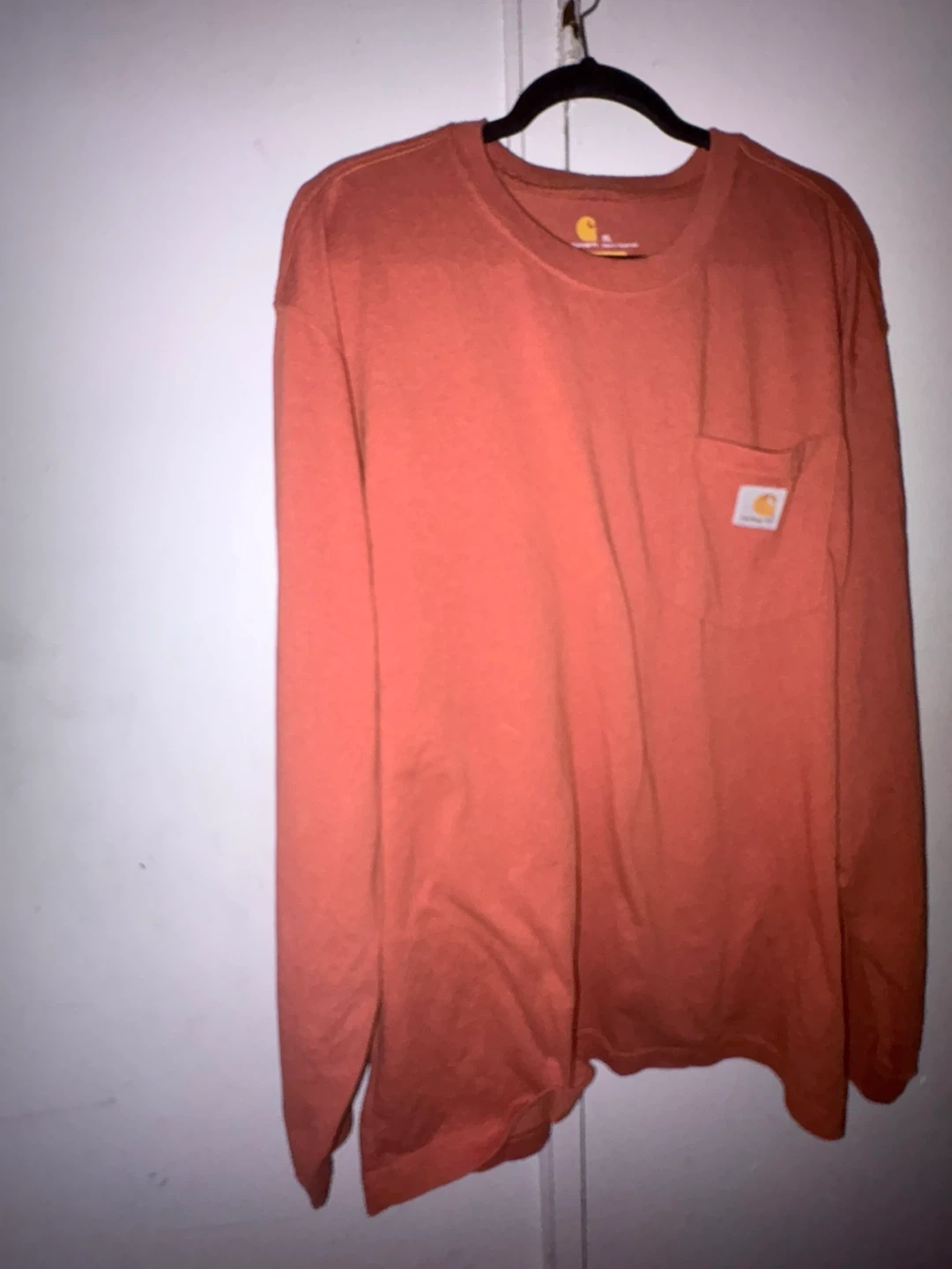 Carhartt long sleeve t-shirt in a coral orange color. It has a pocket on the chest with a small Carhartt logo tag. Classic crew neck style.