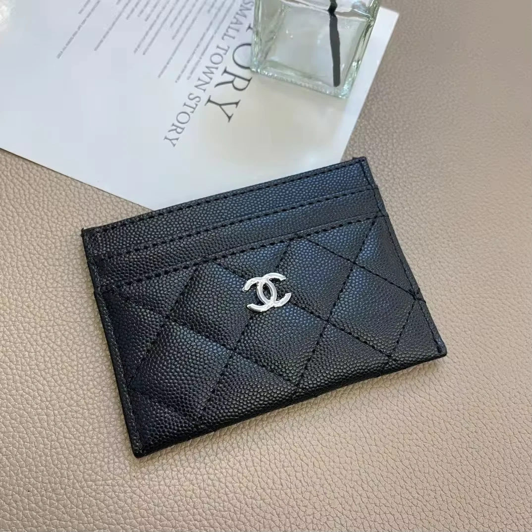 Classic black quilted card holder . Crafted from caviar leather with silver detail. It has multiple card slots for easy organization.