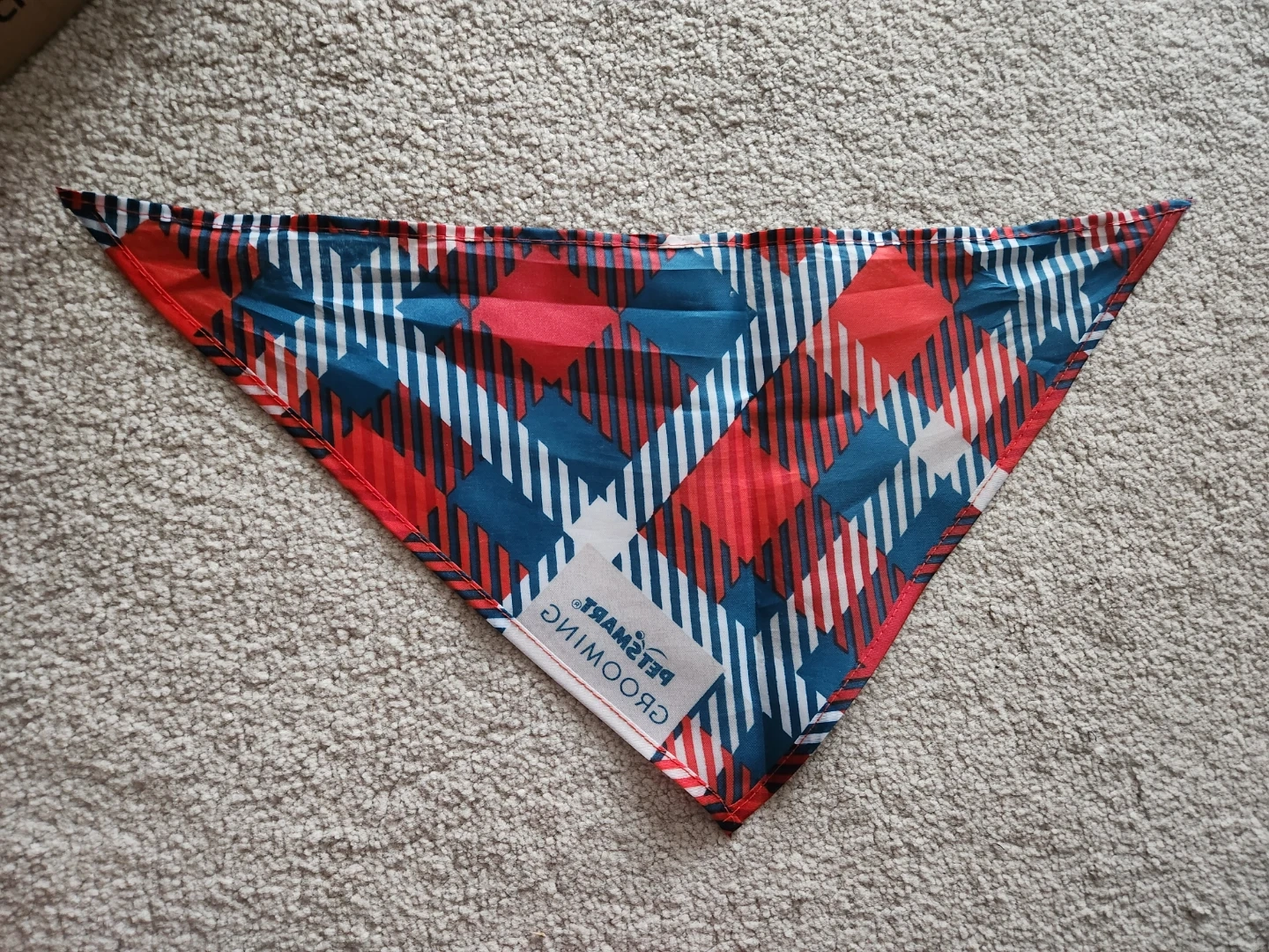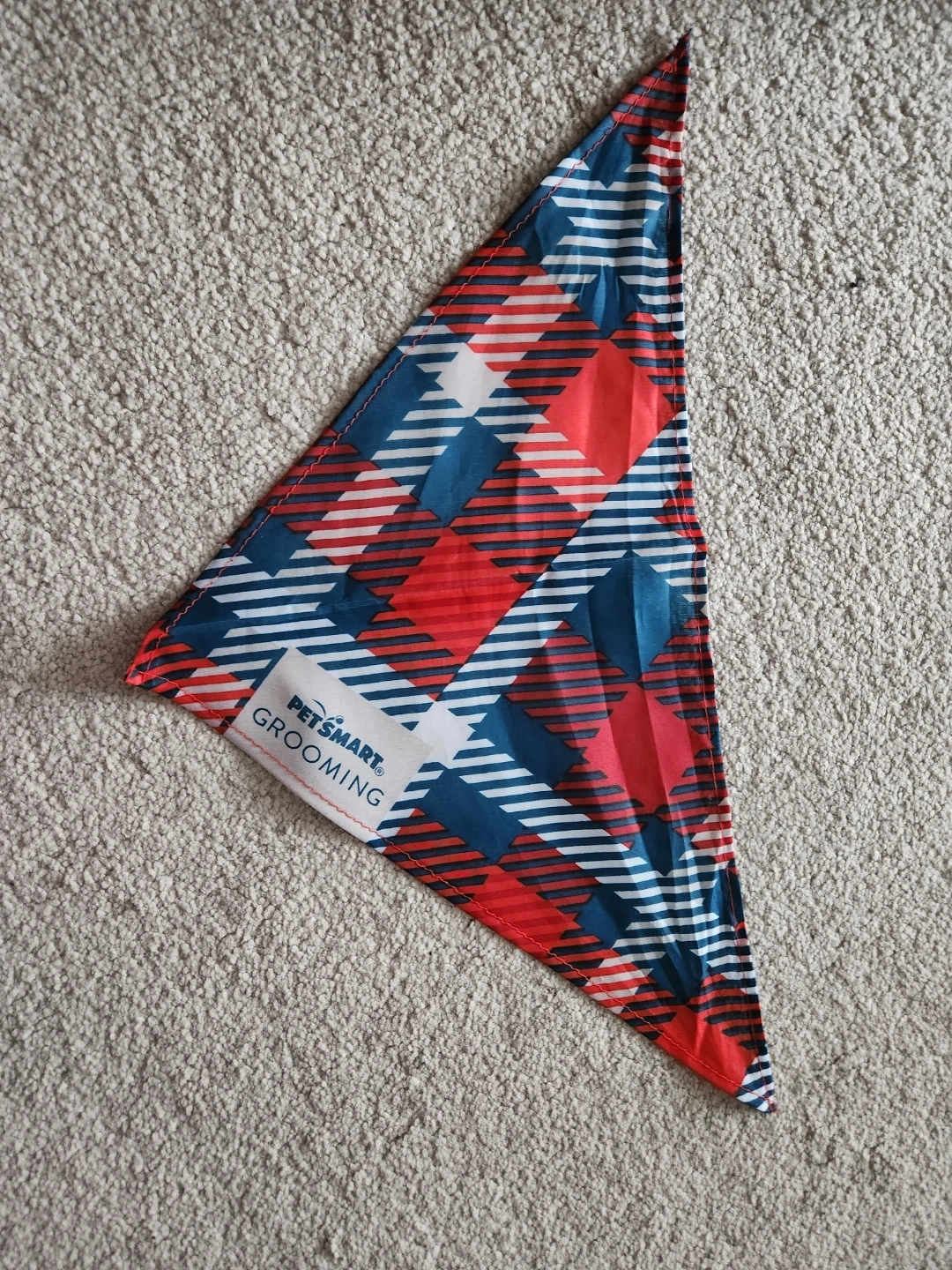 This is a PetSmart Grooming bandana. It's designed with a red, white, and blue plaid pattern. It's great for dressing up your furry friend for any occasion!