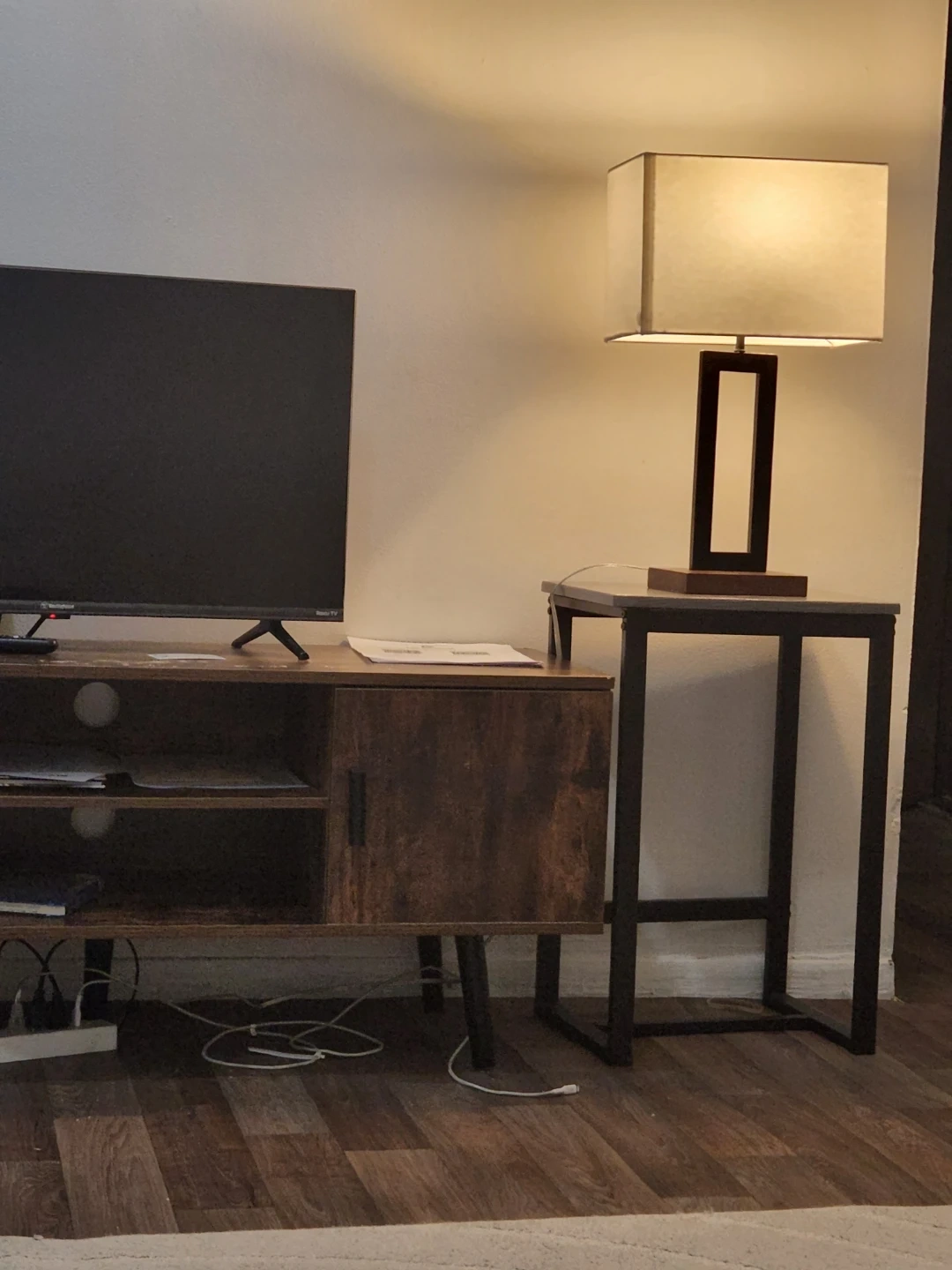This table lamp features a dark wood-finished rectangular base and stem, topped with a creamy rectangular fabric shade. It provides a warm, ambient light. The lamp is approximately 24 inches tall. It's a stylish addition to any room!cash only