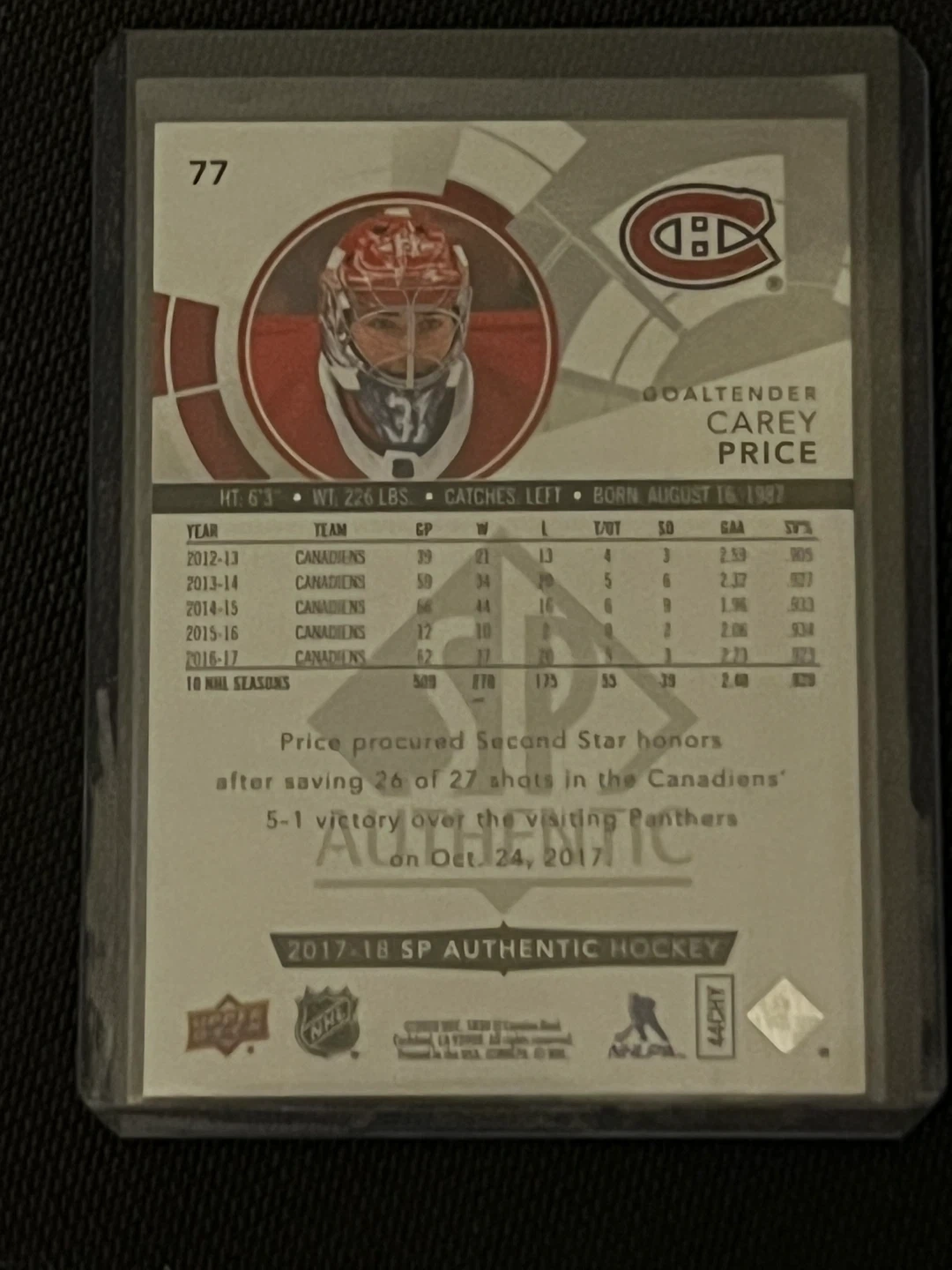 This is a 2017-18 SP Authentic hockey card featuring Carey Price. It includes his stats, career highlights, and biographical information. It's a collectible for hockey fans.