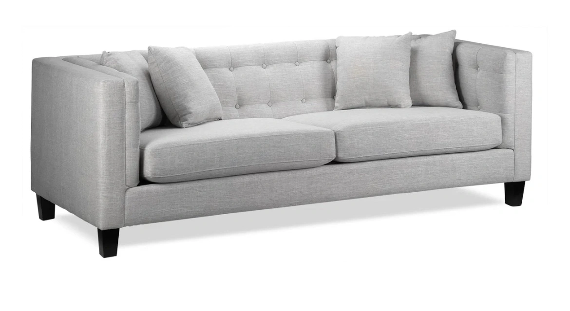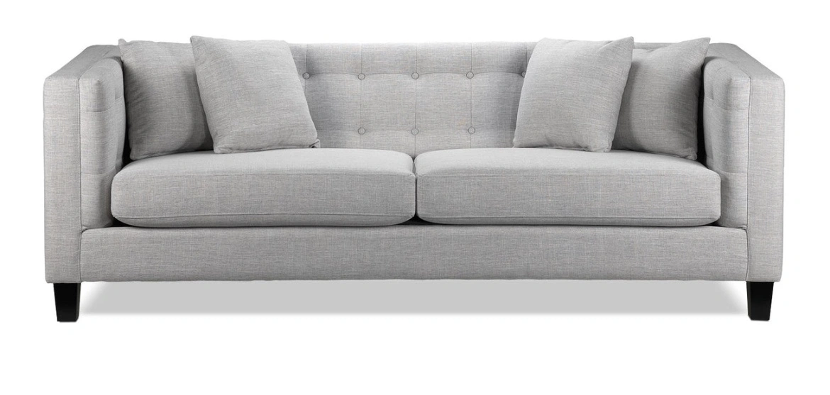 A grey sofa with tufted back and black legs.