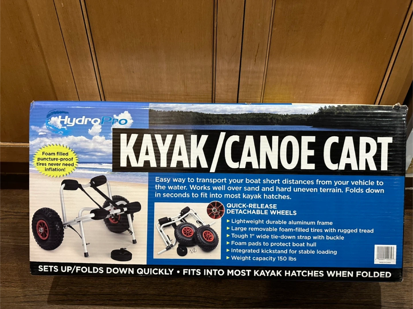 Selling a brand new HydroPro Kayak/Canoe Cart, still in its original packaging! It sets up and folds down quickly with quick-release detachable wheels. It's designed to fit into most kayak hatches when folded. Key features include: - Lightweight durable aluminum frame - Large removable foam-filled tires with rugged tread - Tough 1" wide tie-down strap with buckle - Foam pads to protect the boat hull - Integrated kickstand for stable loading - Weight capacity of 150 lbs