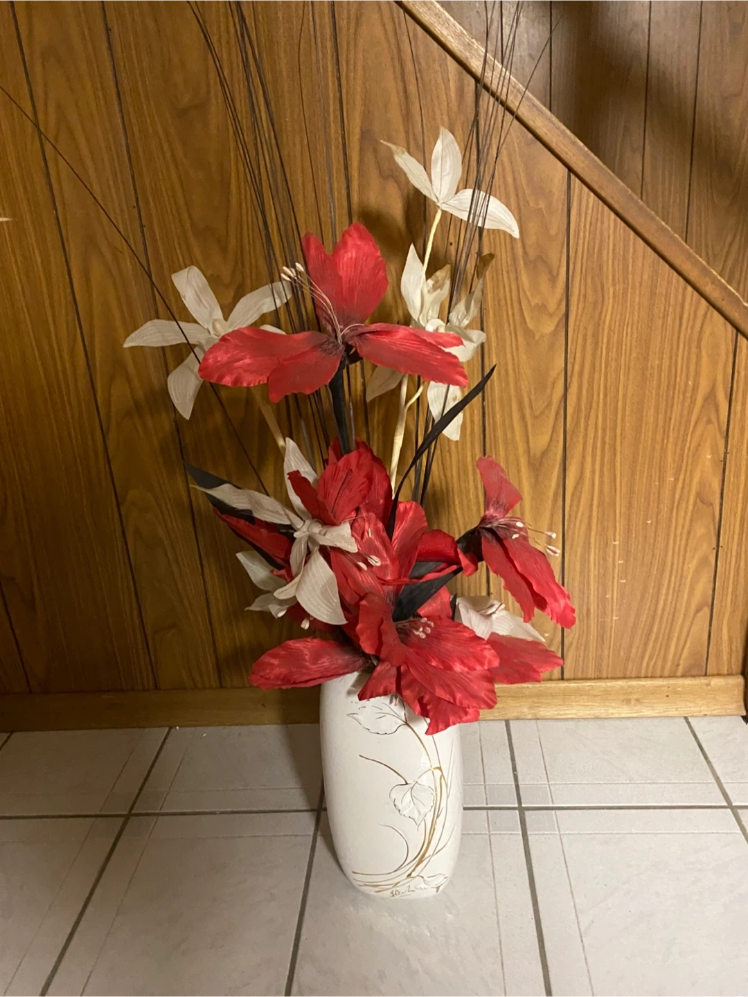 A striking artificial floral arrangement featuring red and white flowers with dark accents. It's presented in a white vase adorned with delicate gold-leaf style line art. This piece adds a touch of colour and style to any room.