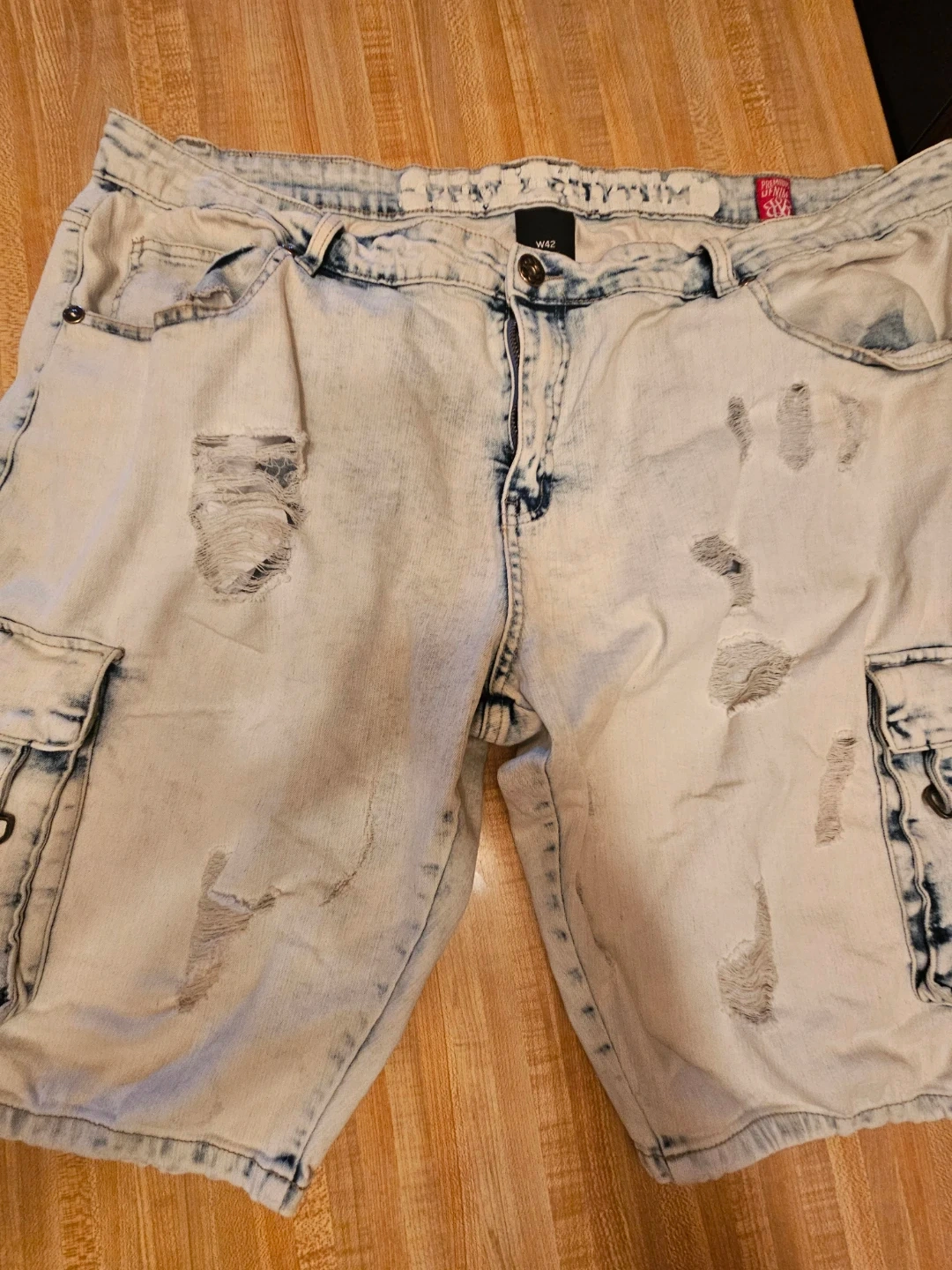 These B&B Premium Denim cargo shorts are a size W42. They're made with 97% cotton and 3% span. Distressed details throughout! Size W42 x L21.