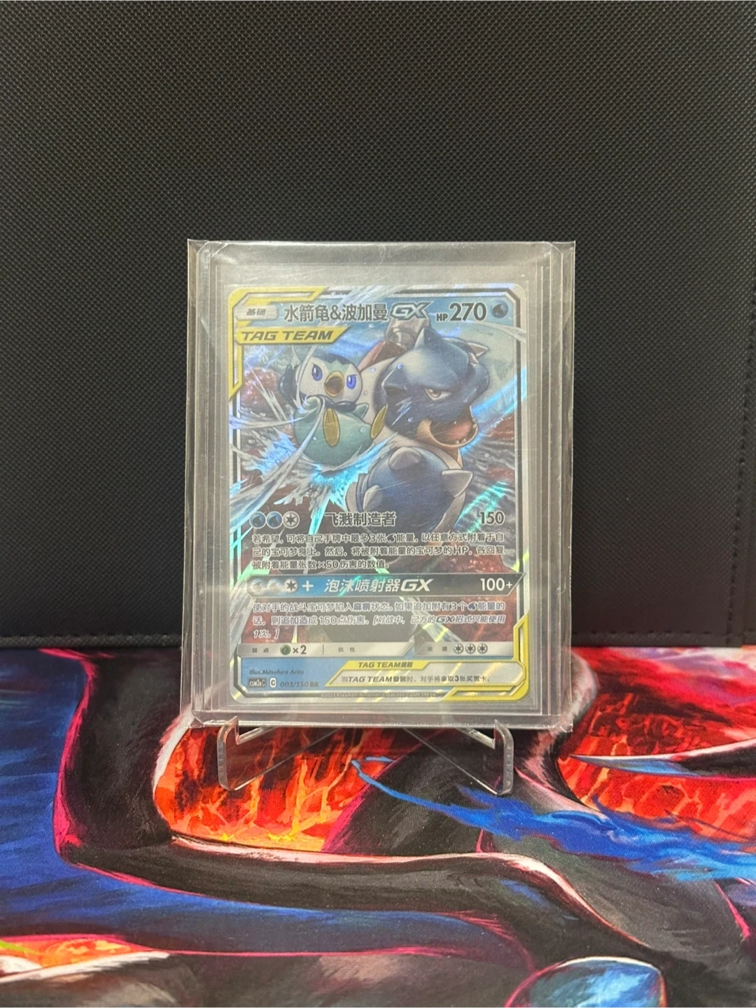 This is a Pokemon TAG TEAM GX trading card. It features Blastoise & Piplup GX artwork. This card has a GX attack and is in a protective sleeve.
