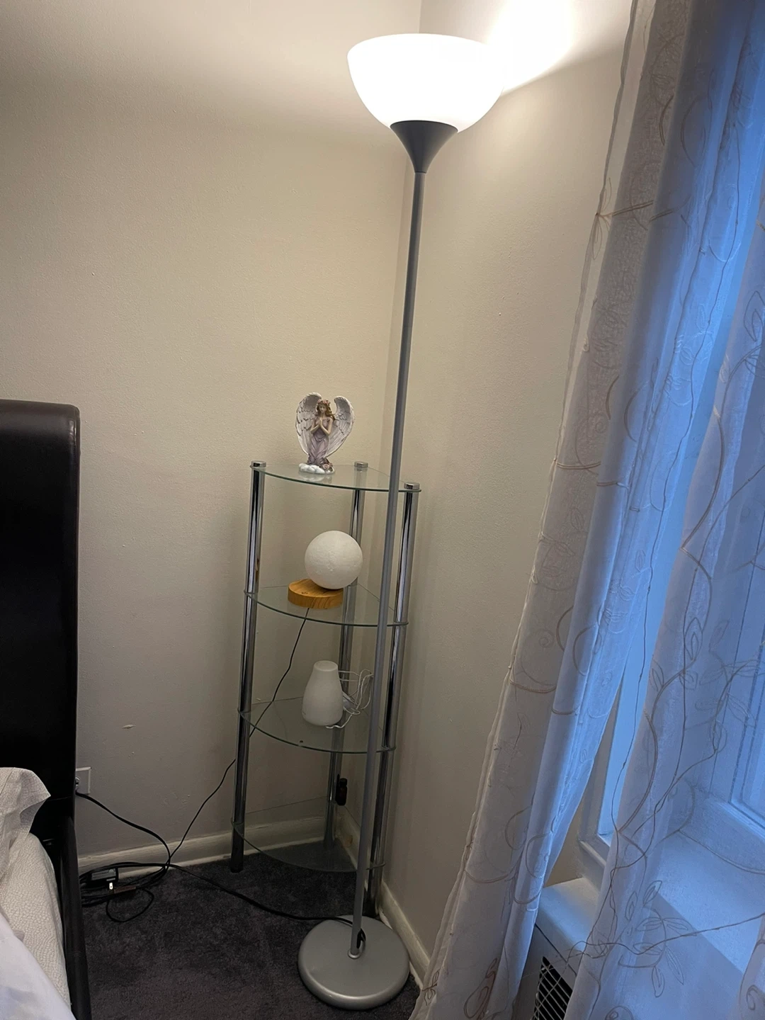Selling a floor lamp in good condition! It has a sleek, modern design that would look great in any room. It provides ample lighting and is perfect for reading or creating a cozy atmosphere