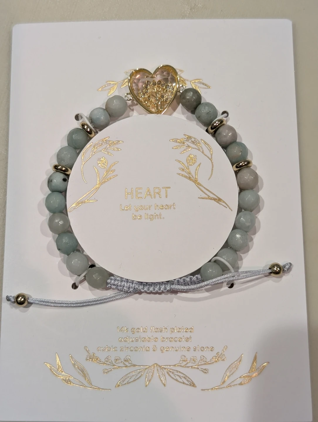 This bracelet features 14K gold flash plating and is adjustable. It's adorned with cubic zirconia and genuine stones. The design includes a heart charm.