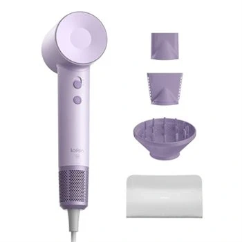 Laifen High-Speed Hair Dryer SE in a lovely lavender colour. It's 60% slimmer and 75% lighter than conventional dryers! Multiple heat and speed settings are available, including a temperature cycling mode. Includes various attachments for different styling needs.