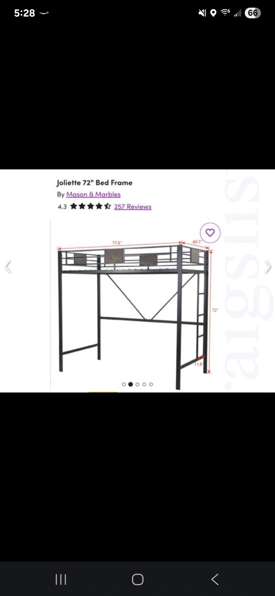 Metal frame with wooden accents. Features a ladder. A great addition to any space for relaxing or sleeping. Space on bottom for desk/ Sofa...